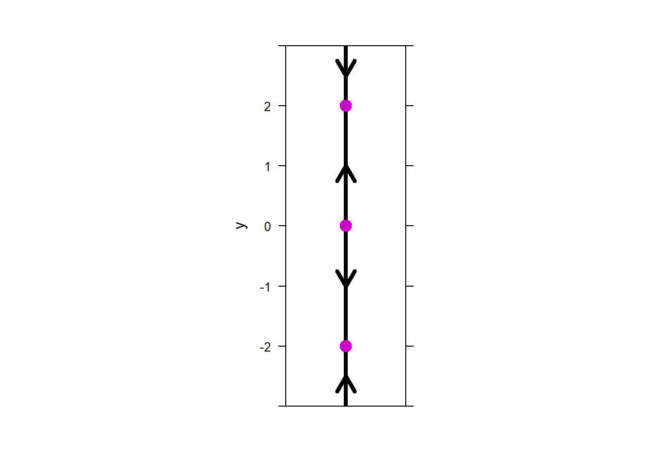 The equilibrium solutions for this ODE are \(y = 0\), \(y = 2\), and \(y = - 2\). To find the directions in which the solutions flow, we determine the rates of change between the equilibrium solutions. In this case we will check the rates when \(y = - 3, - 1,\ 1,\ 3\).