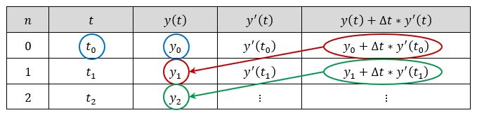 since \(t_{n + 1} = t_{n} + \Delta t\). We now see the recursive nature of this calculation. The table below shows the initial condition, \(\left( t_{0},y_{0} \right)\), in the blue circles. Euler’s method is worked from left to right by calculating the slope, \(y'(t_{n})\), and the next approximation \(y\left( t_{n + 1} \right)\). Note: the step size \(\Delta t\) is fixed for the entire computation, and the following notation is used: \(y_{n} \equiv y\left( t_{n} \right)\).