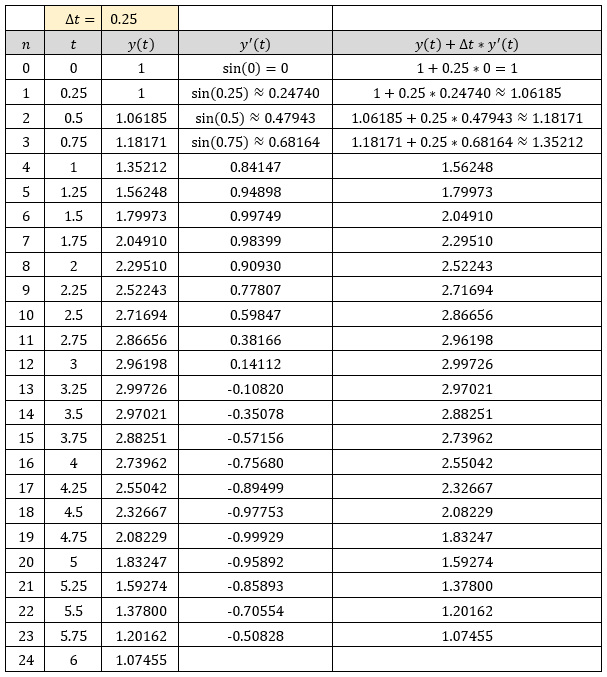 \(n\) | \(t_n\) | \(y_n\) | \(y'_n=\cos(t_n)+y_n\) | \(y_n+\Delta t\cdot y'_n\) |