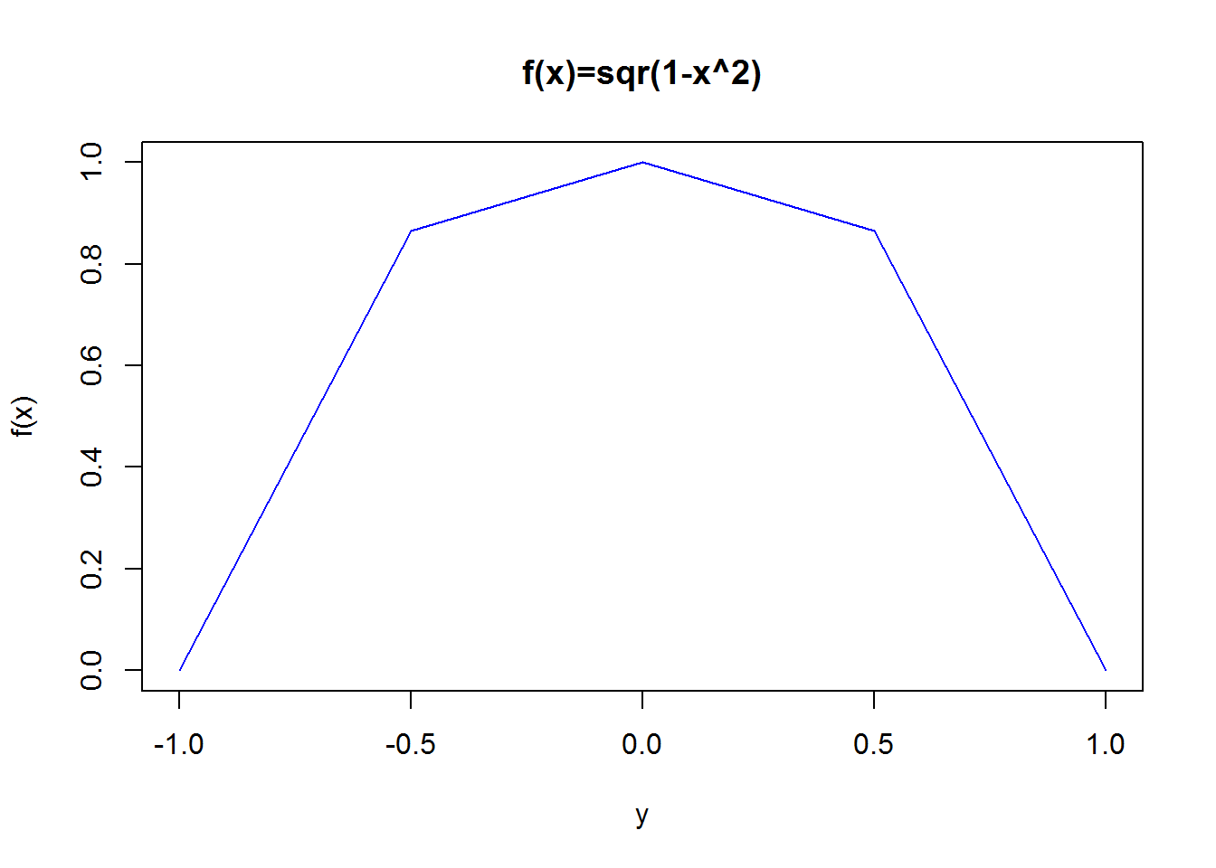 plot(y,semicirc(y),main="f(x)=sqr(1-x^2)",