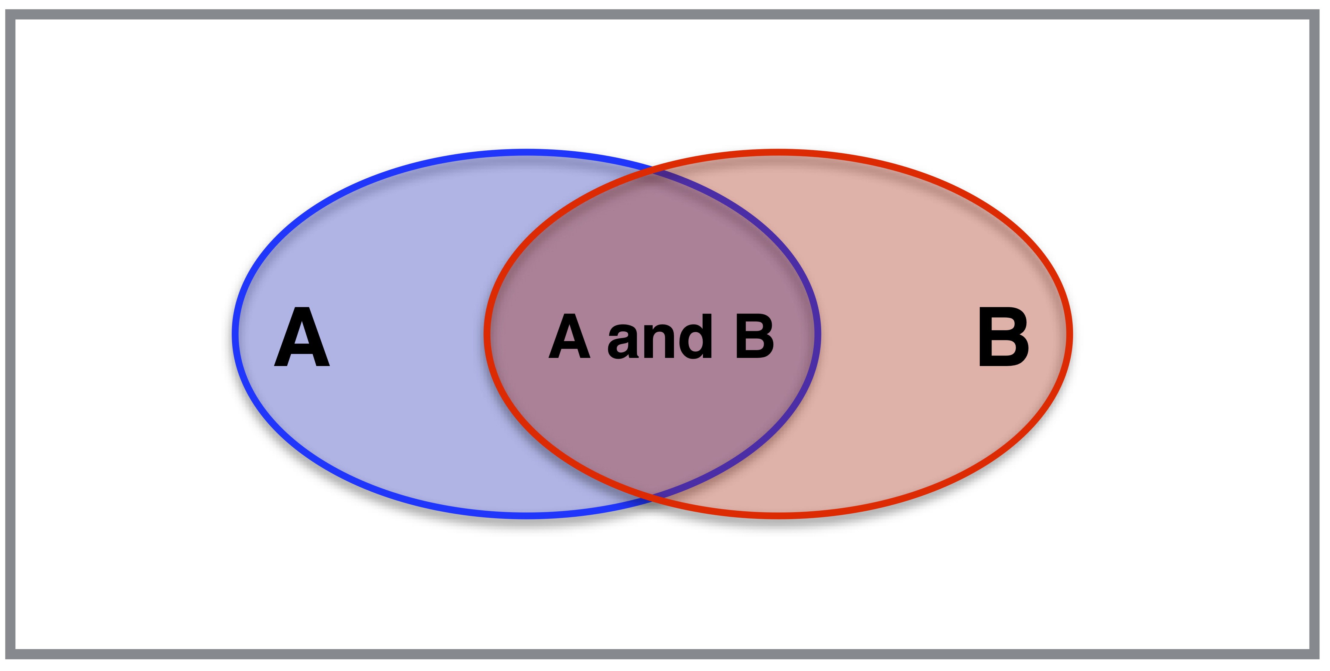 You can visualize this in a Venn diagram like the one above. Imagine throwing darts at this rectangular area. What is P(A or B), the probability that a randomly thrown dart will land either in the blue oval (A) or the red oval (B)? Let’s assume I’m really bad at darts, so that each point in the rectangle is equally likely.
