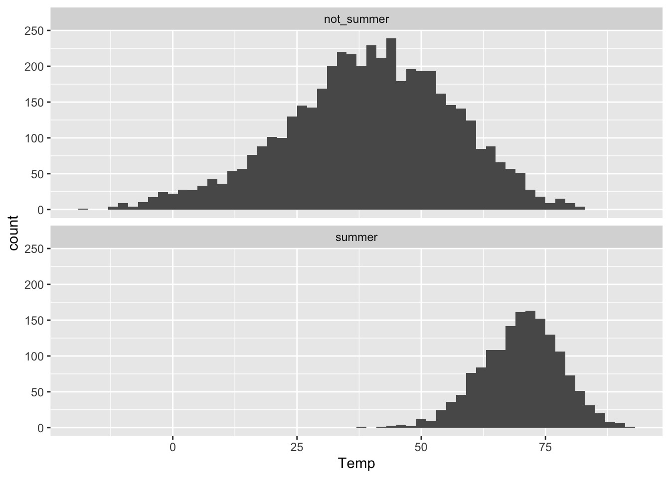A nice feature of R is that we can calculate any common summary statistic grouped according to the value of some other variable. For example, take (a simplified version of) our summary pipeline from the lesson on Summaries, where we calculated summary statistics for temperatures in Rapid City: