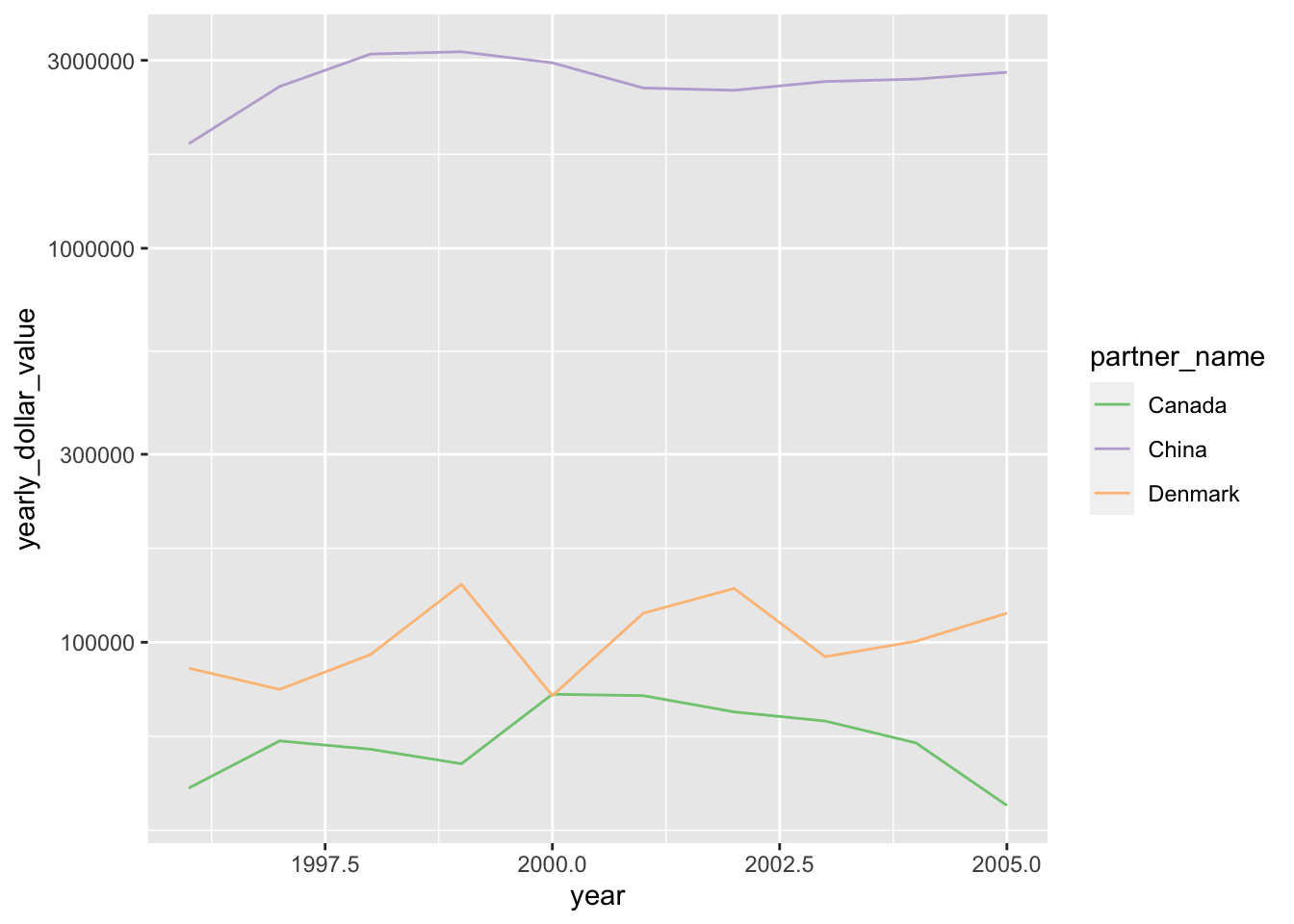 Now we can make our line graph of yearly_dollar_value versus year. We’ll color in each line according to trading partner, like this: