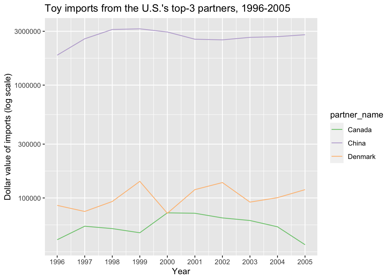 top3_partner_names = c('China', 'Denmark', 'Canada')Here c means “combine,” and it’s how we create a list21 of multiple elements. This list of names will be useful when we turn to our second main task: plotting toy imports over time for each categories, separately for each of these three top trading partners.