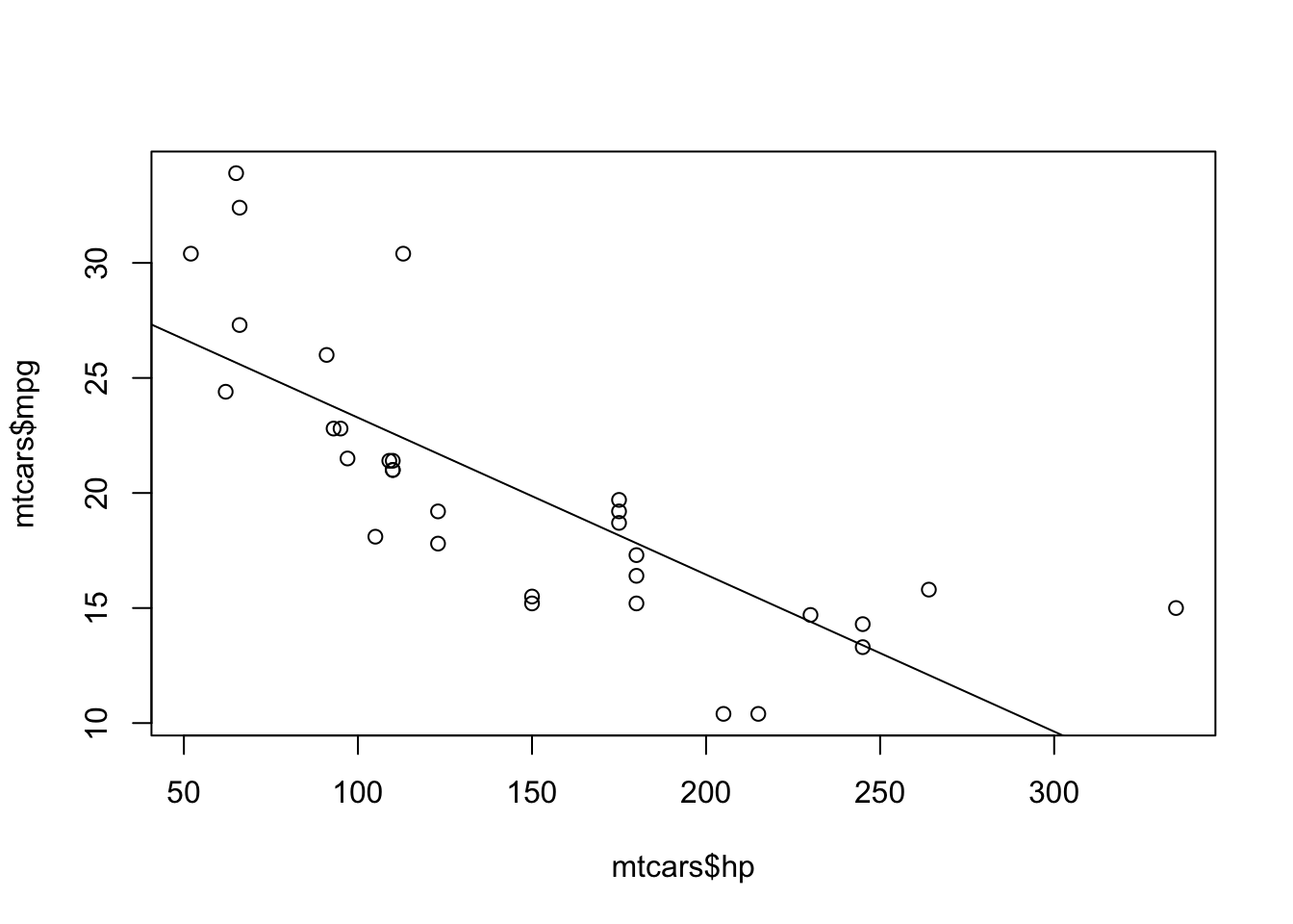 plot(mtcars$hp, mtcars$mpg)