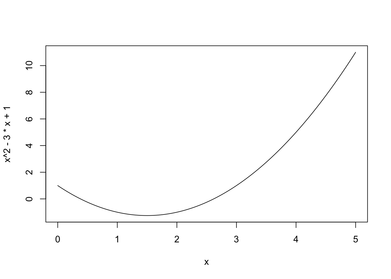 Curve(x^2 - 3*x + 1, from=0, to=5)## Error in Curve(x^2 - 3 * x + 1, from = 0, to = 5): could not find function "Curve"