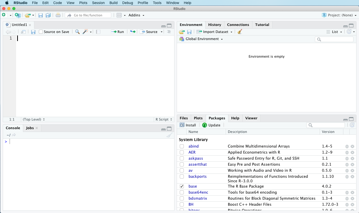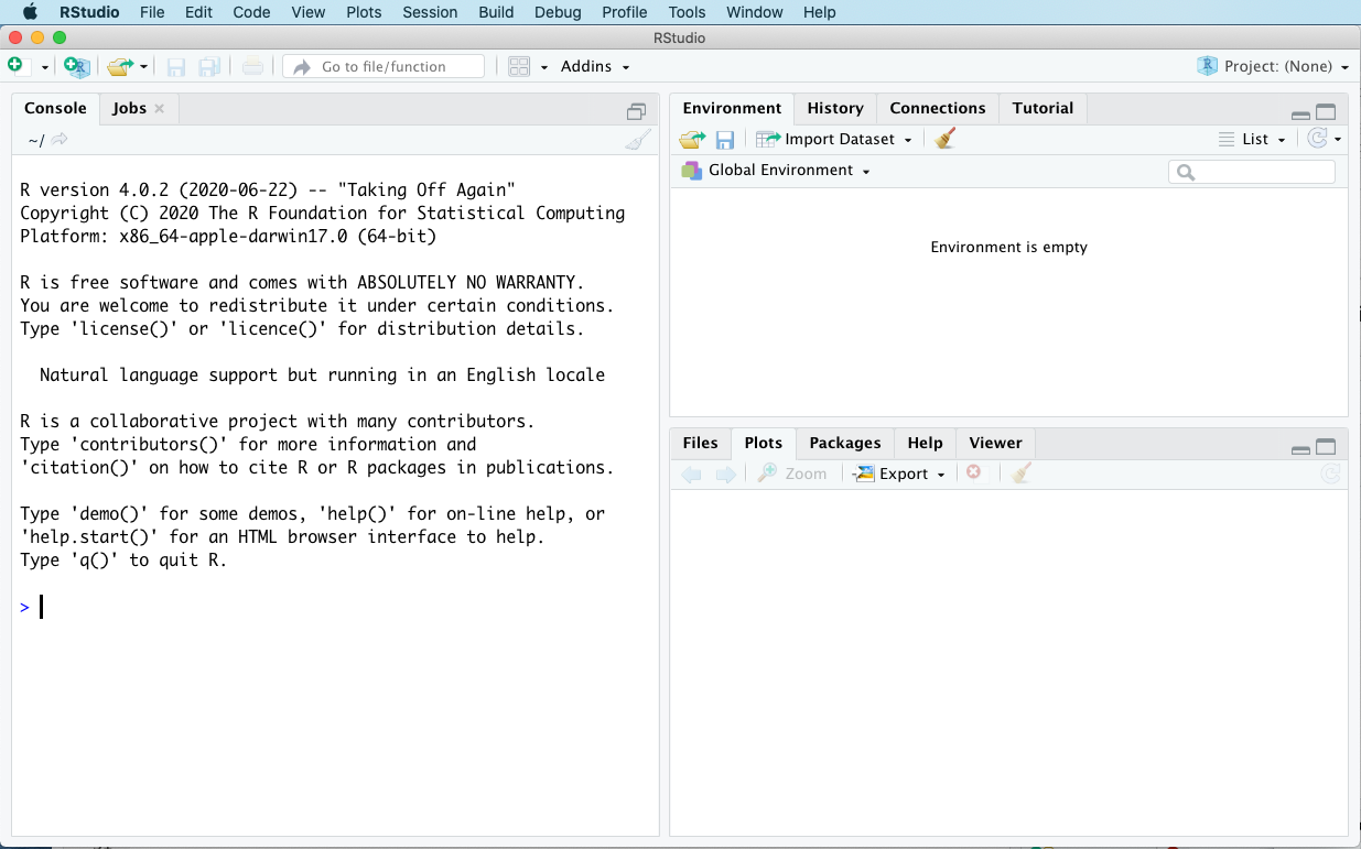 Go ahead and open up RStudio for the first time. On a Mac or Windows machine, this is as simple as finding where you’ve installed the RStudio app (not the R app) and double-clicking its icon. You should see something like this (with possible minor aesthetic differences, depending on your computer’s operating system):