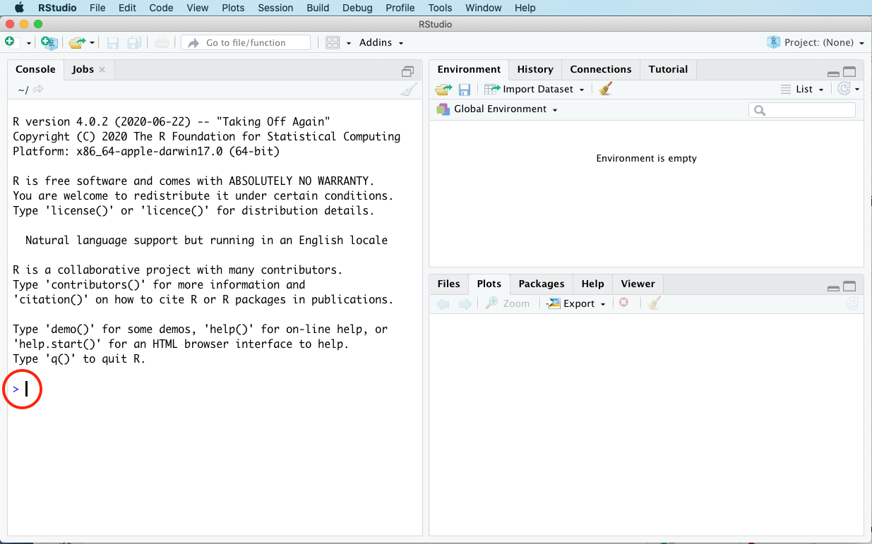 For now, just focus on the left-hand panel (the console). More specifically, focus on the blinking cursor in the console, right next to the angle bracket (>). That > symbol is a prompt; it’s R’s way of saying, “Tell me what to do by typing statements right here.” Below I’ve circled it in red: