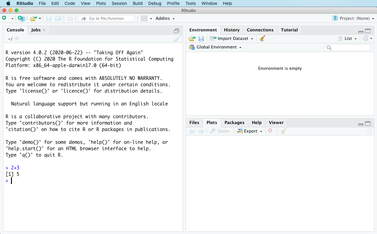 Congratulations! You’ve just run your first line of R code — in this case, a statement that tells R to do some simple arithmetic. In the console, R is telling you that the result of evaluating the statement 2+3 is 5.