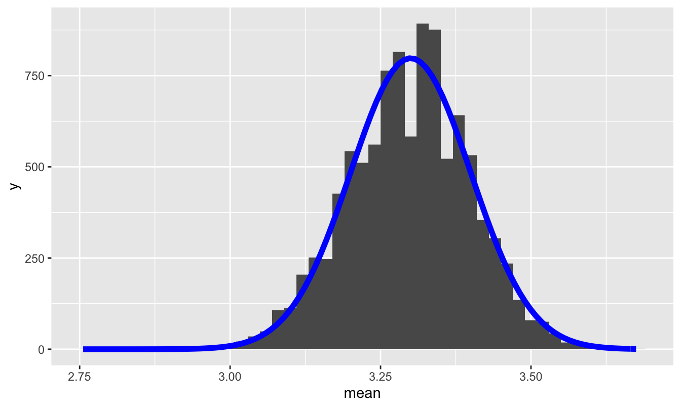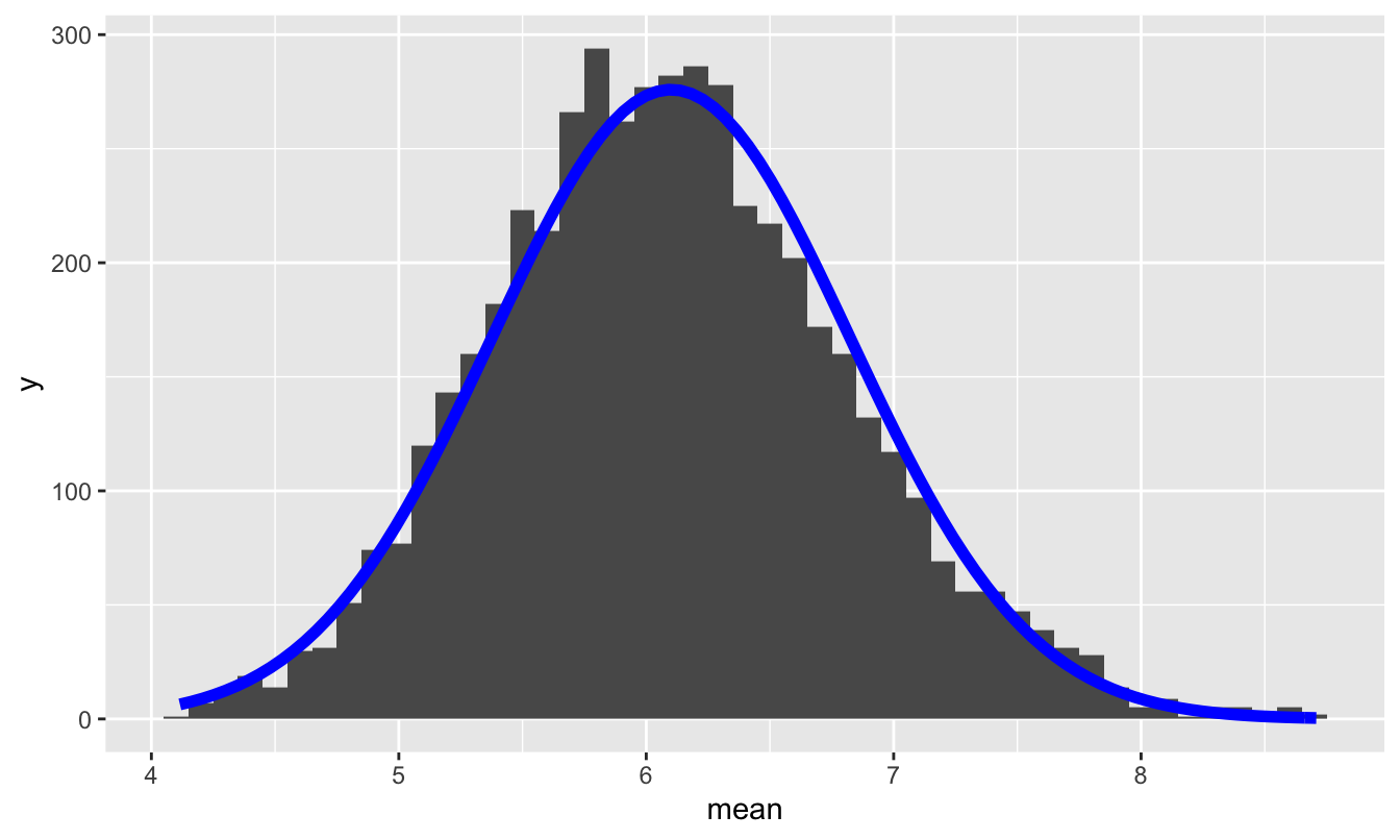 I mean, just look at them. It’s like that famous first line of Anna Karenina, where all happy families are the same. Without getting out your magnifying glass to inspect the scale of the \(x\) axis in each plot, can you tell the difference between these sampling distributions? I sure can’t. They all look the same! More to the point, they all look like this: