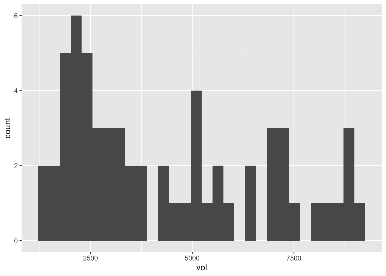 favstats(~weight, data=fedex_sim)## min Q1 median Q3 max mean sd n missing