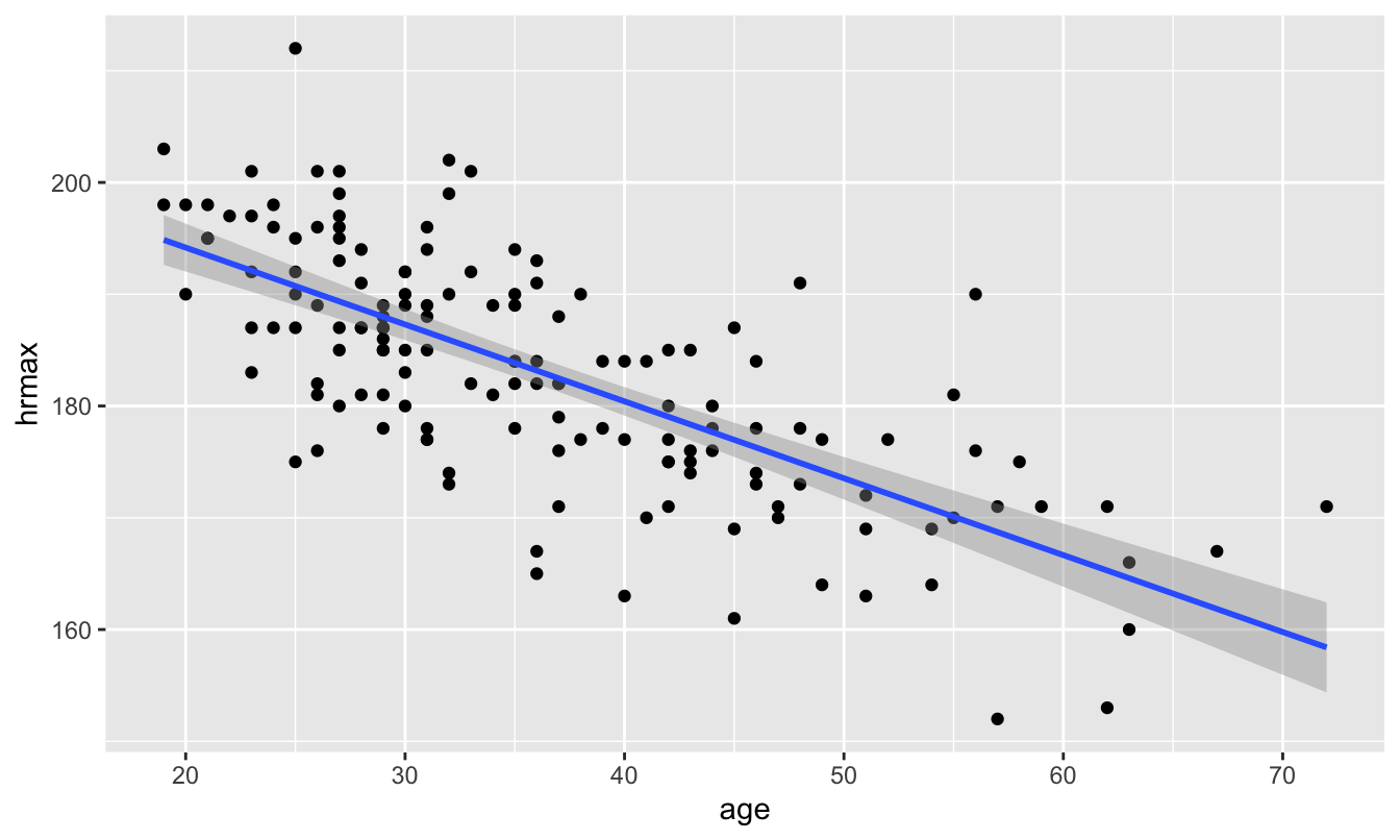lm_heart = lm(hrmax ~ age, data=heartrate)