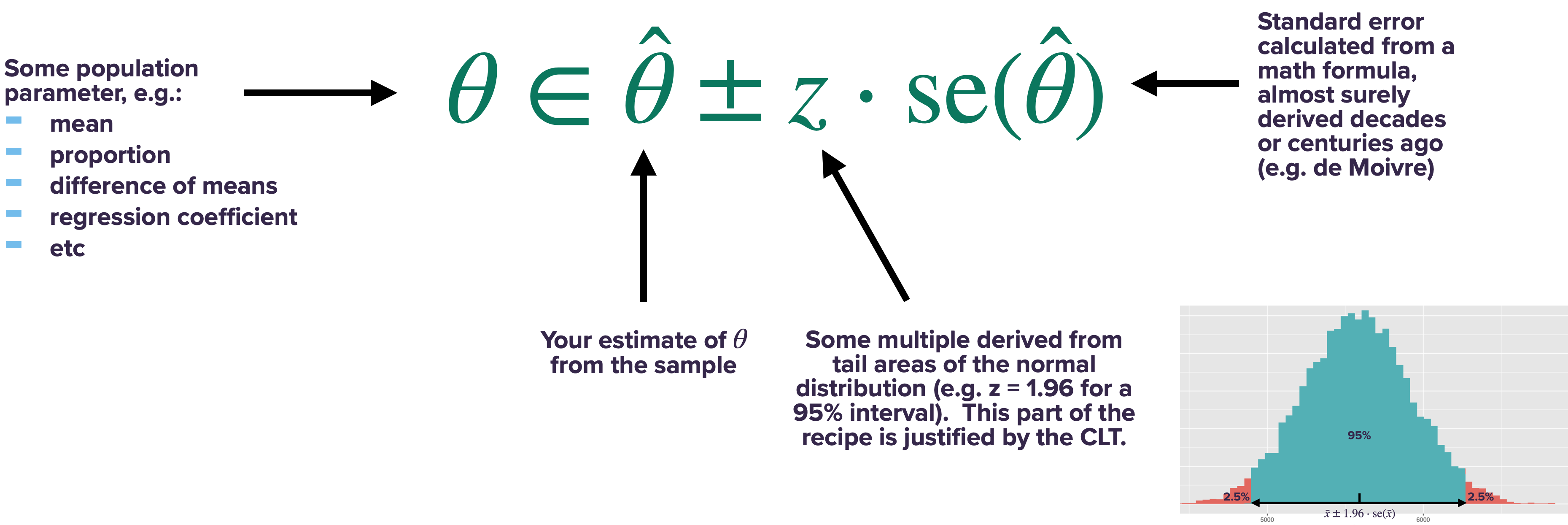 - Most common statistical summaries (means, proportions, regression coefficients, etc) have sampling distributions that look approximately normal for large enough samples.