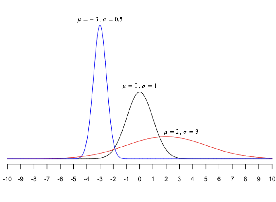 - the mean \(\mu\), which determines where the peak of the distribution is centered.