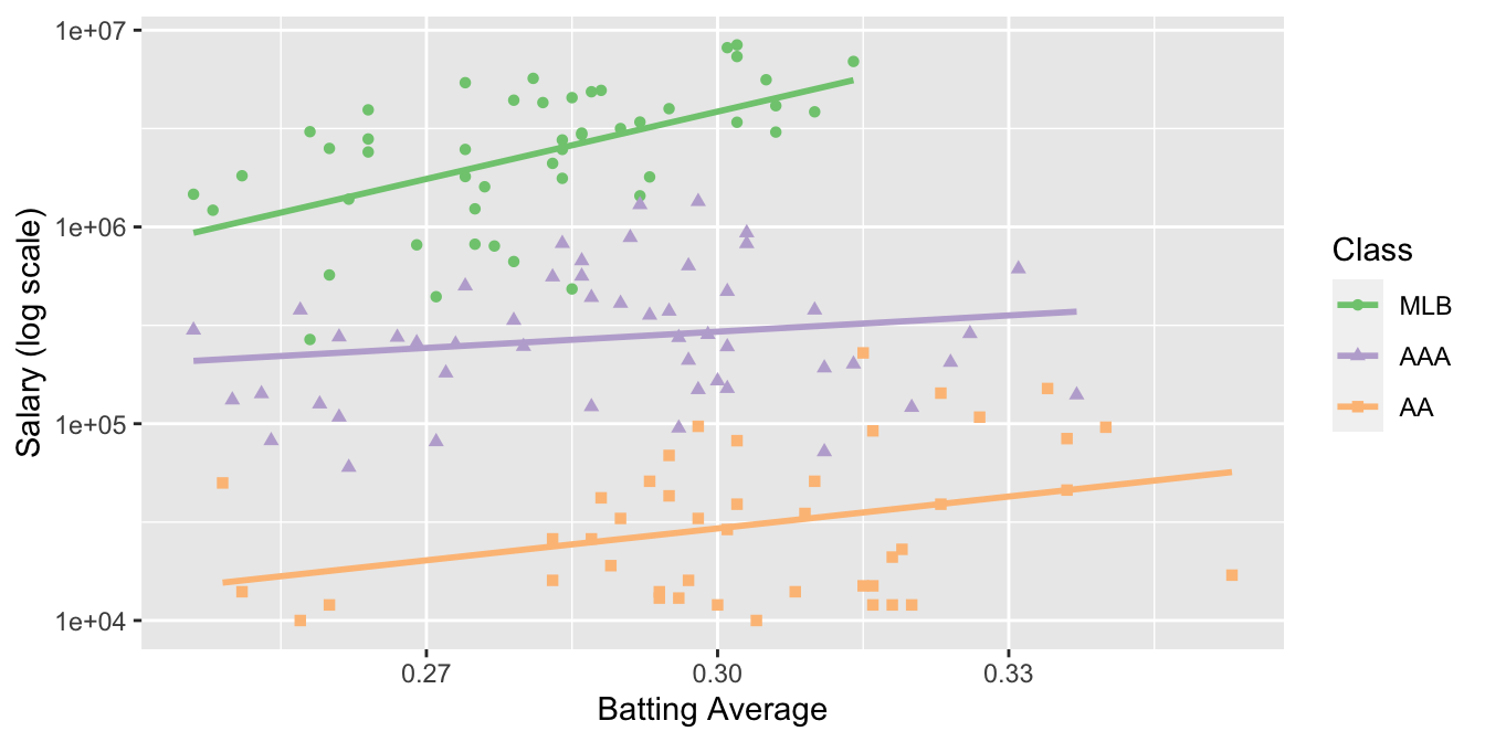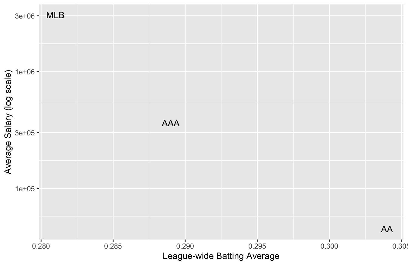 Consider the following data frame on the batting averages and salaries of baseball players across three professional classes: AA, AAA, and the Major League. (AAA is the top minor league just below the Major Leagues, while AA is one one step below AAA.) Batting average is a standard measure of offensive skill in baseball, while here salary is in US dollars. The two columns of the table show league-wide averages across all three classes of play.