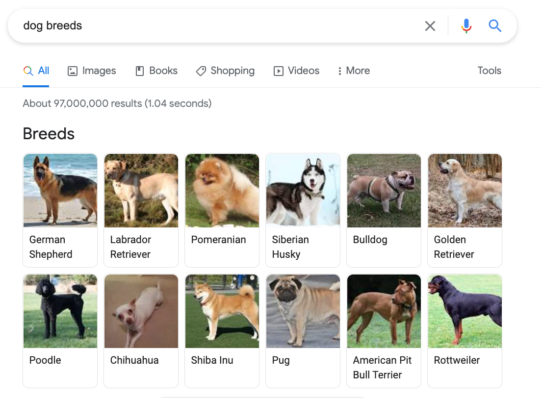 A data set is like the collection of dogs shown above. It consists of cases, also known as examples—here, the individual dog breeds. A collection of cases is called a sample, and the number of cases in the sample is called the sample size, usually denoted by the letter \(n\). Each case can be described in terms of its variables, also known as features or attributes.