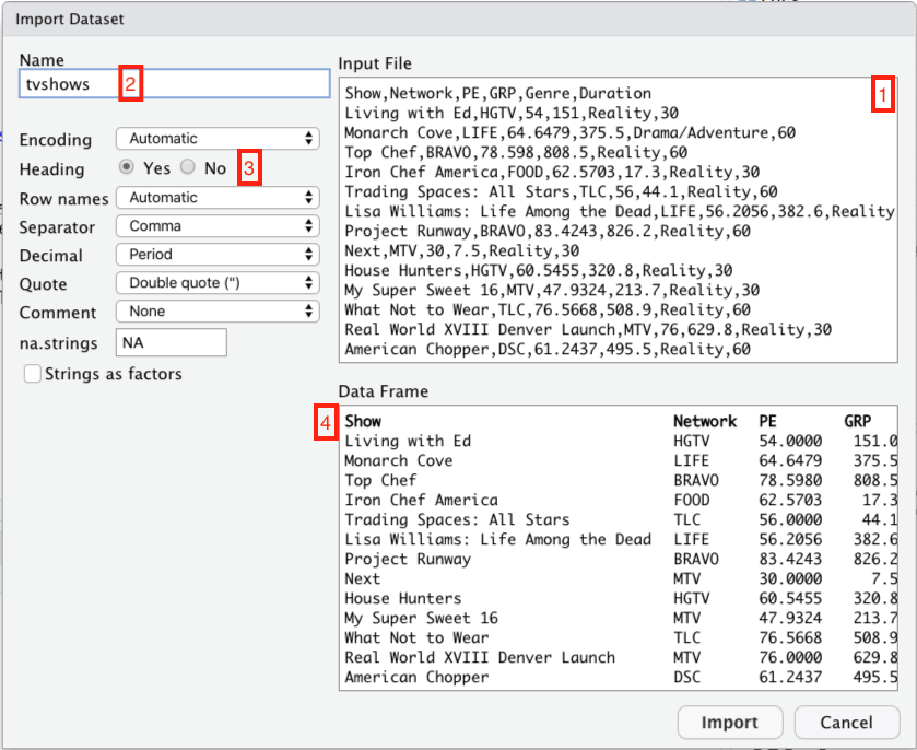 - This tells R whether the data set has a header row—that is, whether the first row contains the names of the columns. Usually R is pretty good at inferring whether your data has a header row or not. But it’s always a good idea to double-check: click