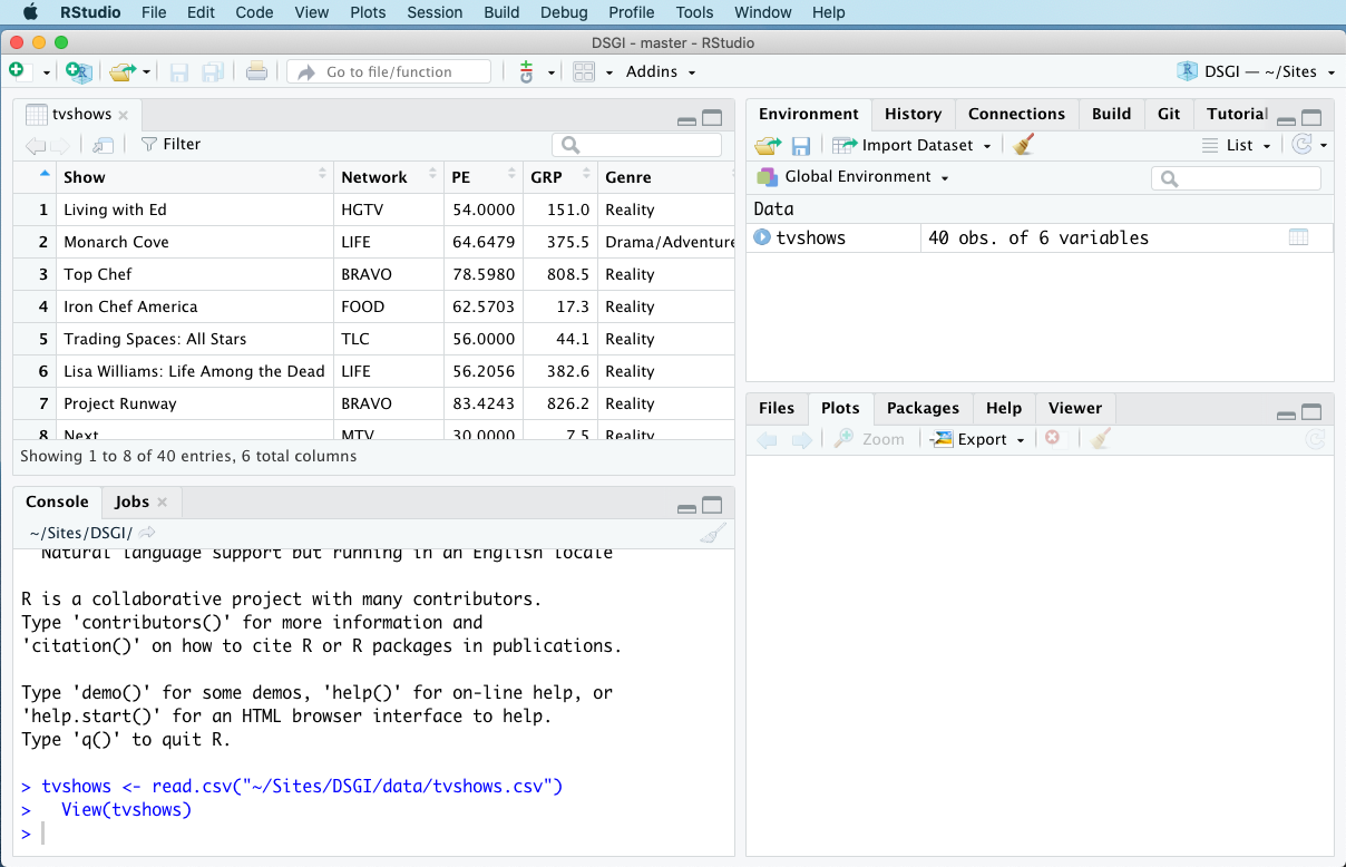 tvshowsis the name of the object we’re creating with the call toread.csv. It’s how we’ll refer to the data set in subsequent statements.