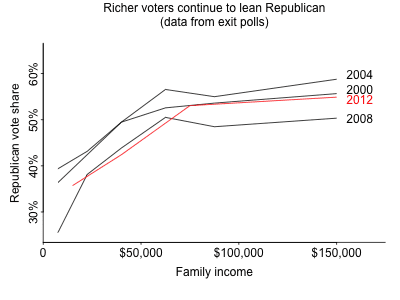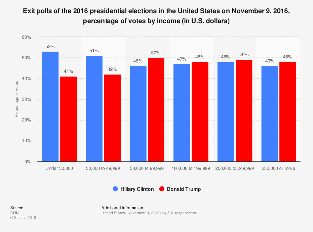 And here is a bar plot from CNN showing the same basic relationship for the 2016 presidential election: support for the Republican candidate generally increases with personal income.