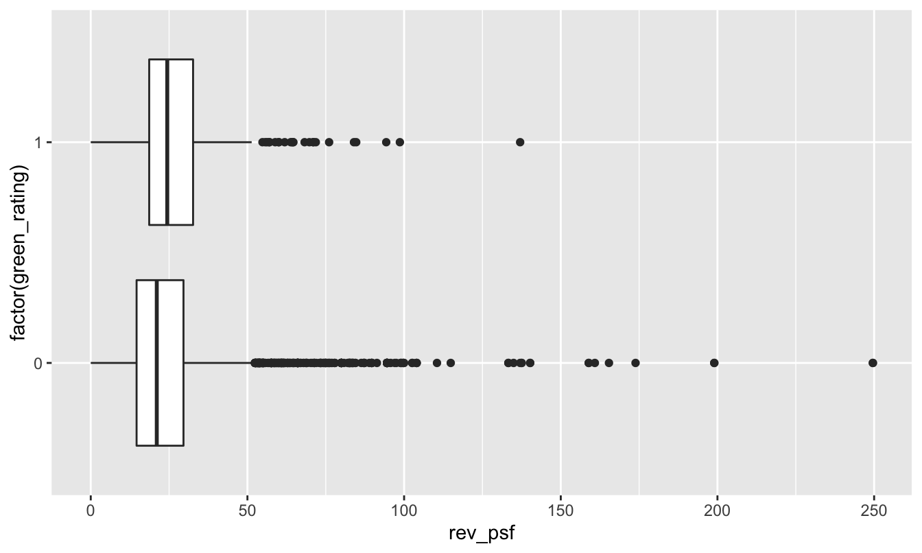 Let’s see a boxplot of revenue versus green rating. In the code below, remember that factor tells R to treat a numerical code (here green_rating, coded as 0 or 1) as a categorical variable: