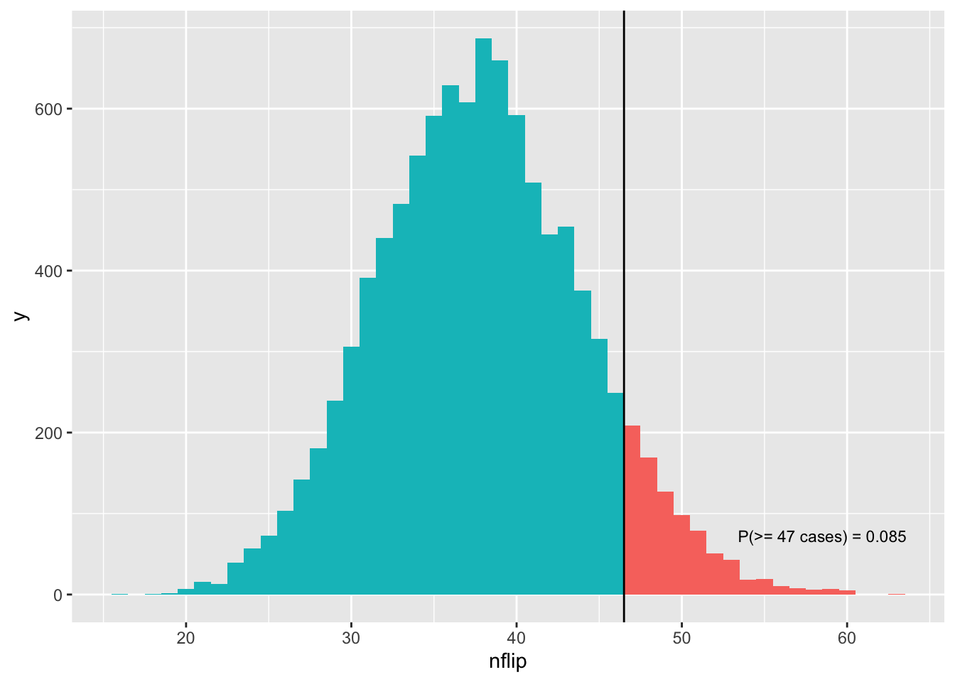 Let’s now visualize the distribution. Remember that our observed test statistic was 47 cancer cases. Can we eyeball how much of the distribution is 47 or larger?