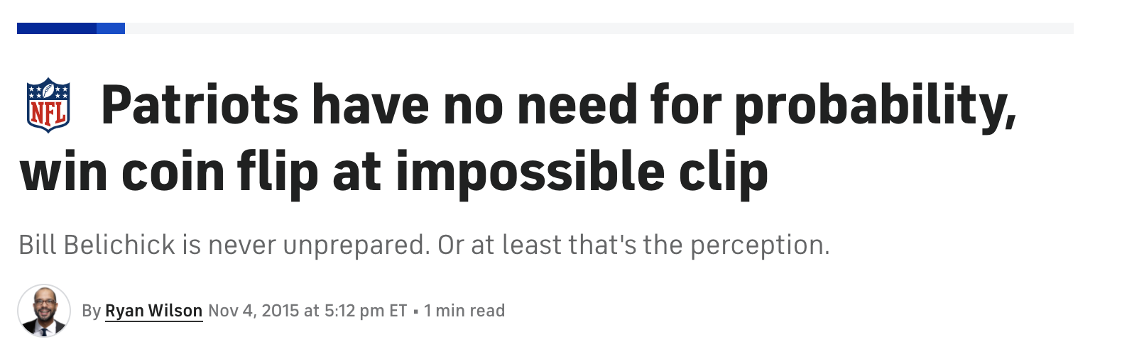 Believe it or not, many people think so. That’s because, for a stretch of 25 games spanning the 2014-15 NFL seasons, the Patriots won 19 out of 25 coin tosses, for a suspiciously high 76% winning percentage. Sports writers had a field day with this weird fact, publishing headlines like this one: