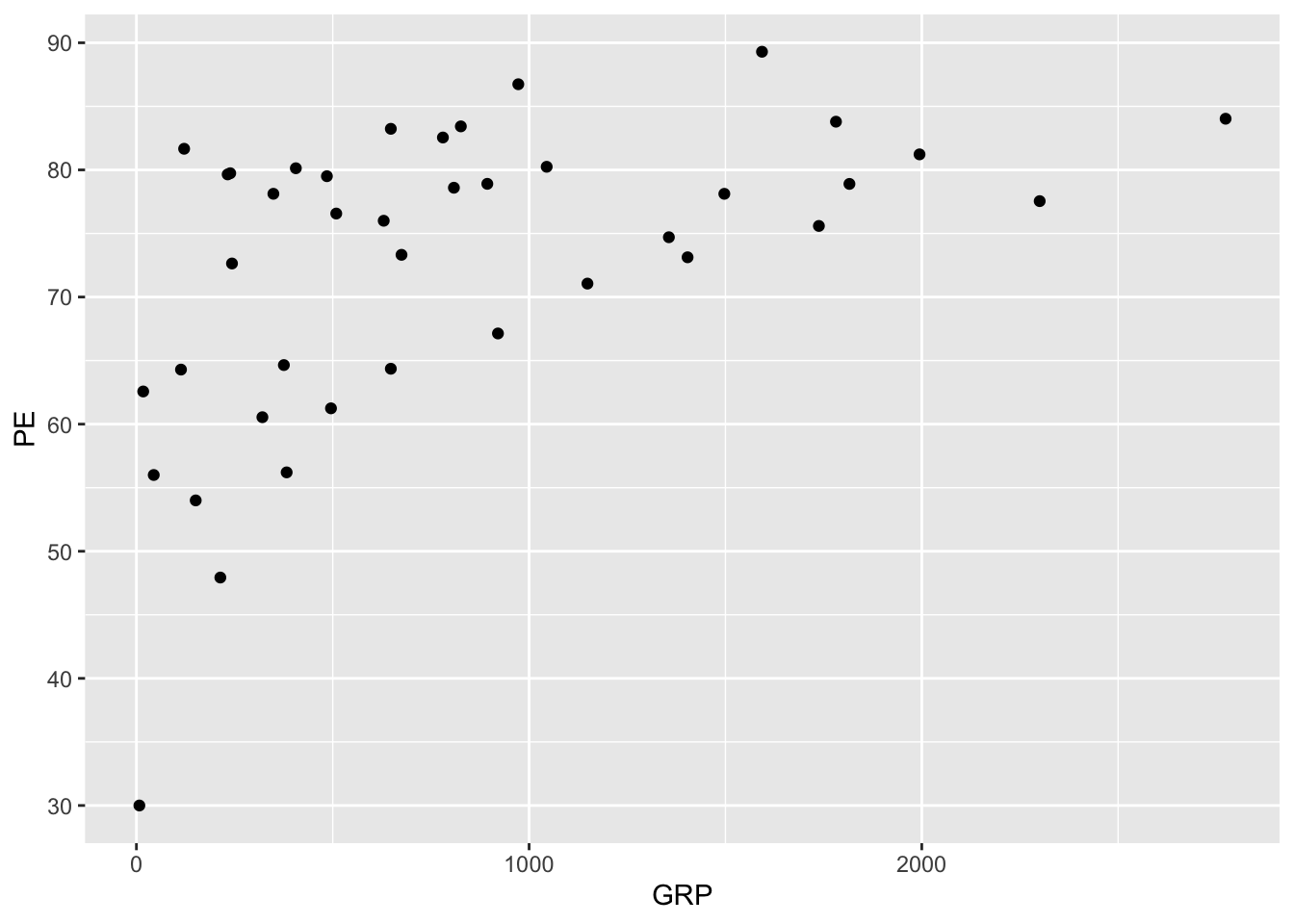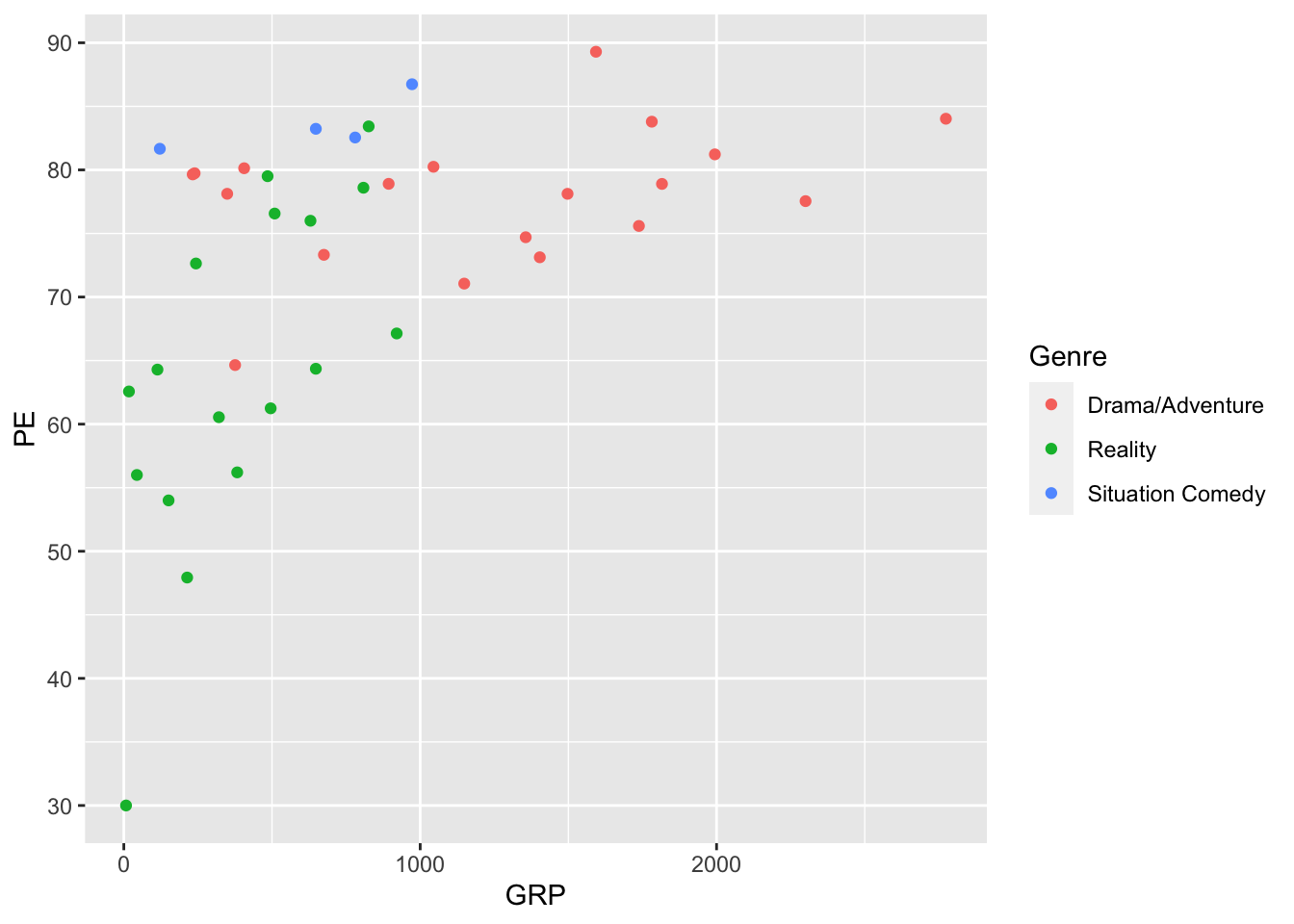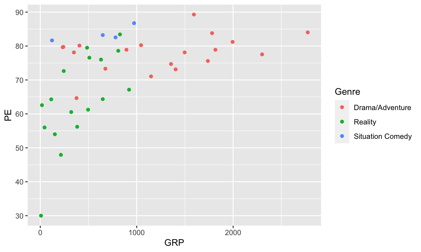 geom_point(aes(x=GRP, y=PE))The first line, ggplot(tvshows), tells R that you’re going to be plotting data from the tvshows data set. All plots in these lessons will begin with a similar line: ggplot(name_of_data_set).