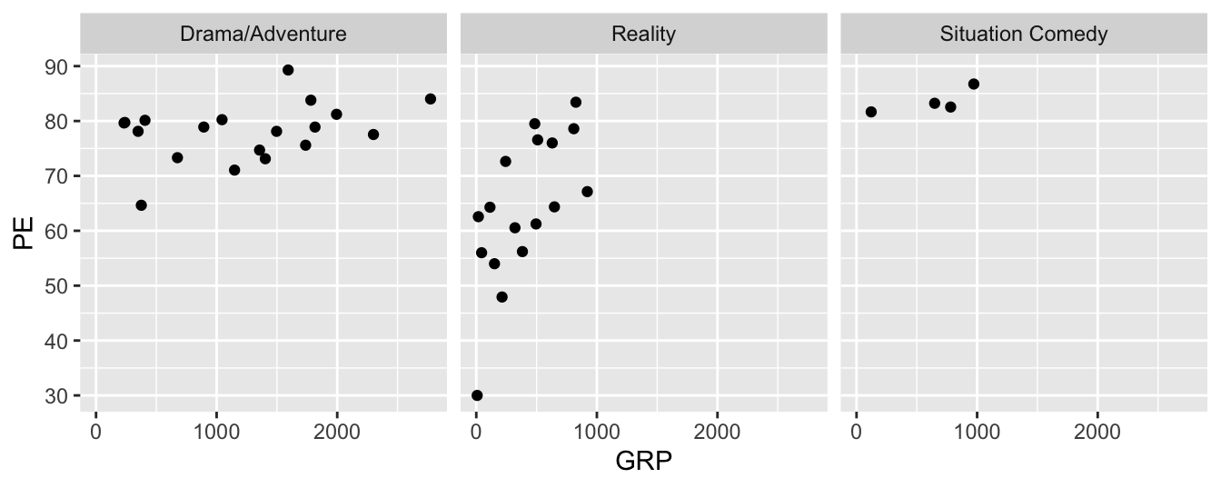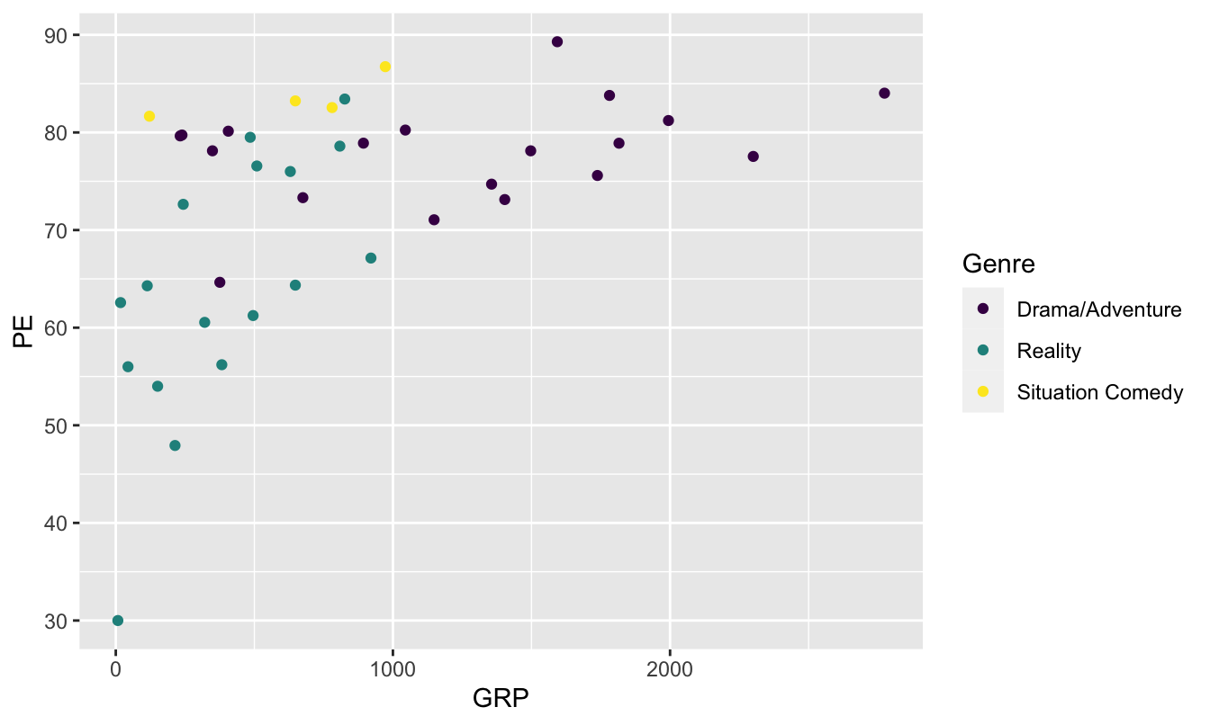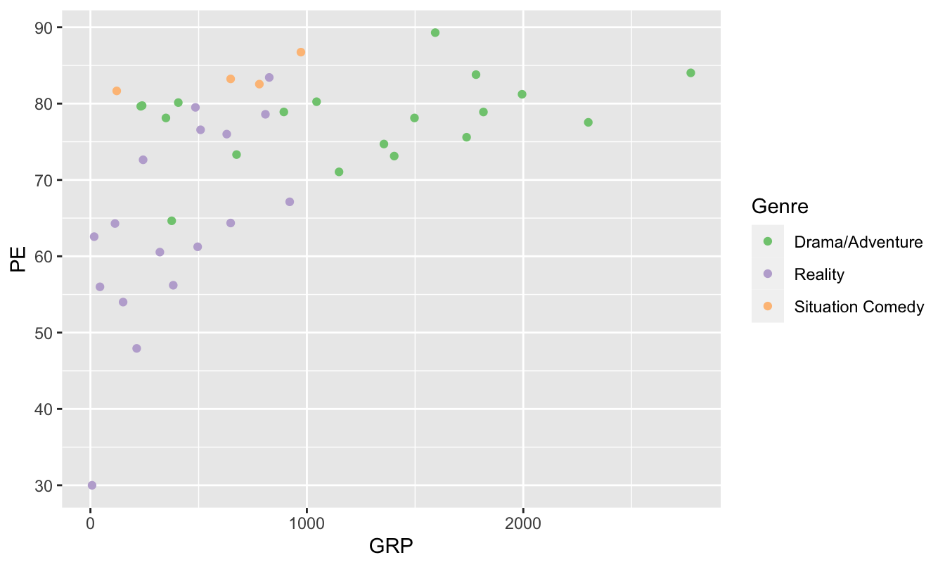 geom_point(aes(x=GRP, y=PE))The first line, ggplot(tvshows), tells R that you’re going to be plotting data from the tvshows data set. All plots in these lessons will begin with a similar line: ggplot(name_of_data_set).