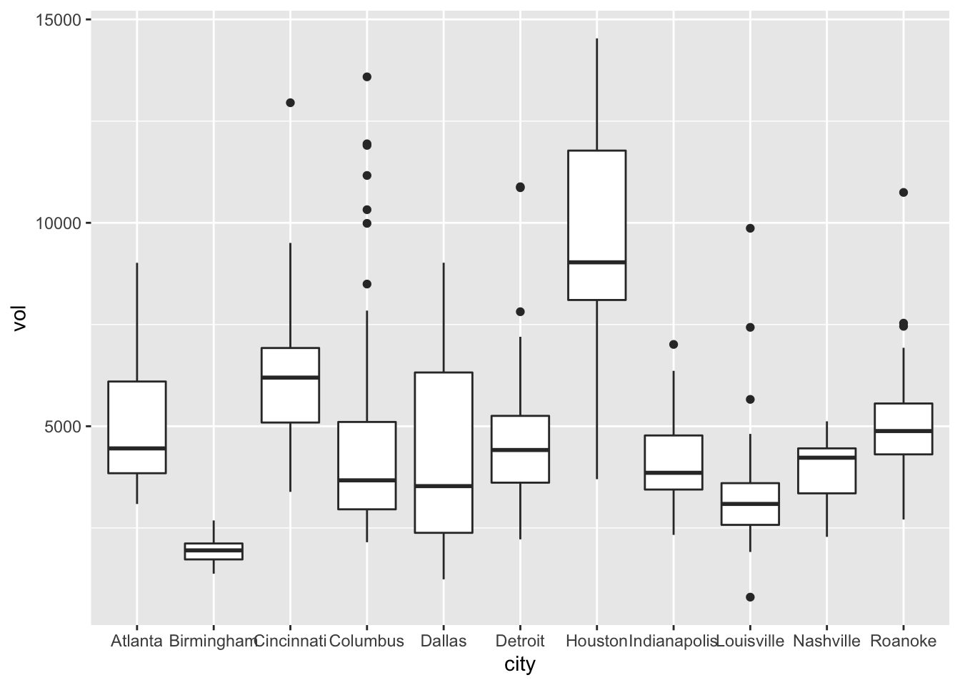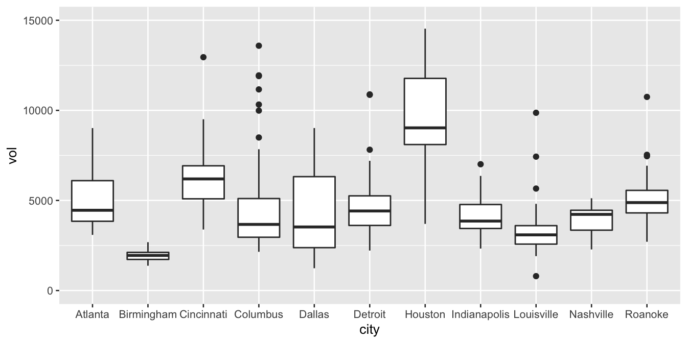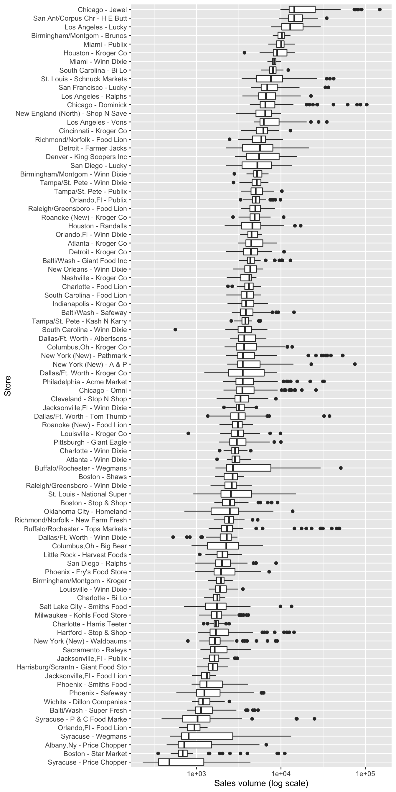 It’s a little bit tedious to change font sizes in ggplot2. But this is something we probably want to do in our boxplot above, because the names of the stores are running together along the \(x\) axis.