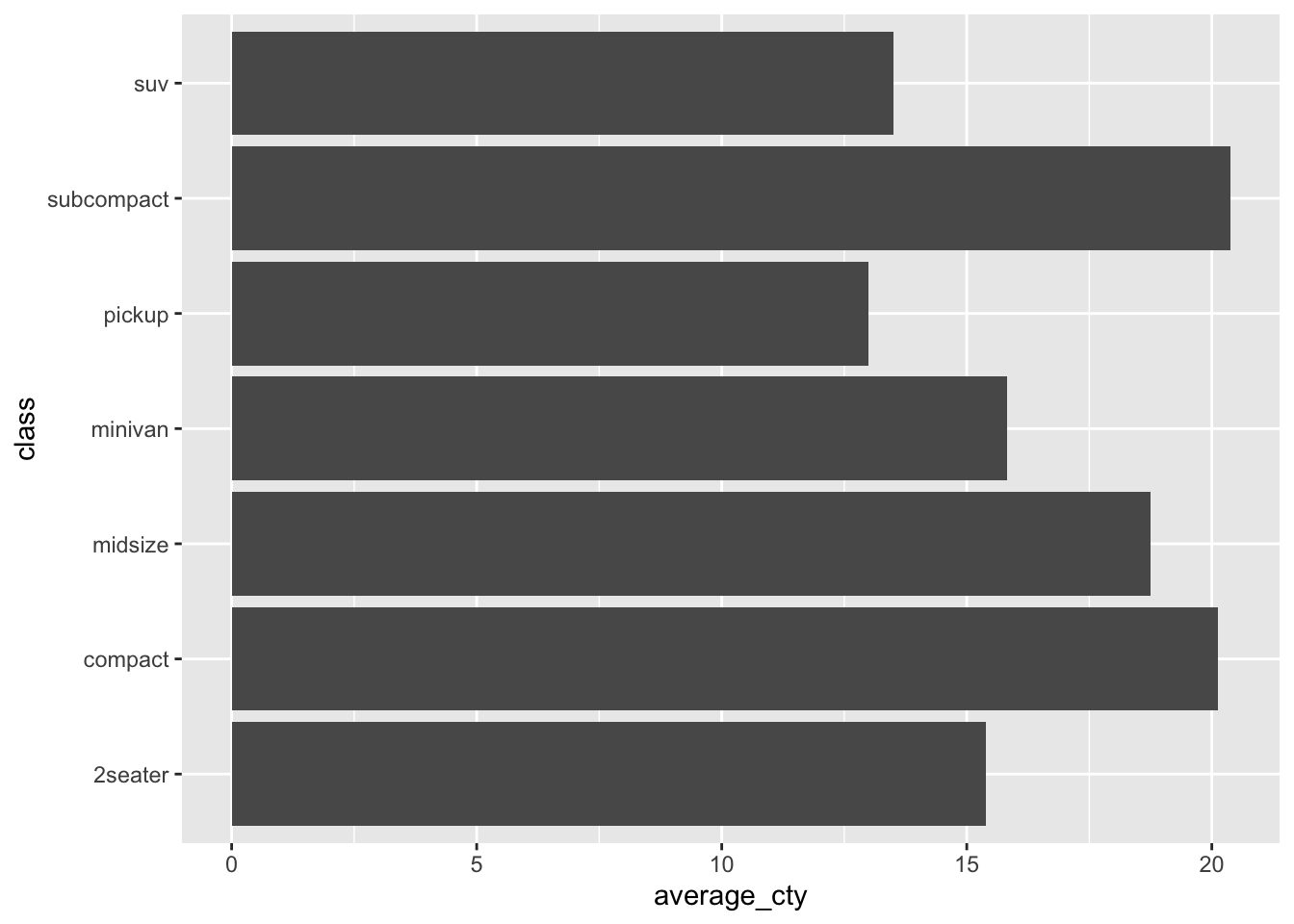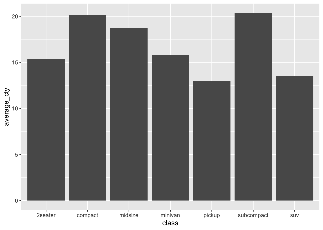 We see seven bars/columns, one per vehicle class. The average_cty variable for that class is mapped to the height (\(y\)) of the bar.