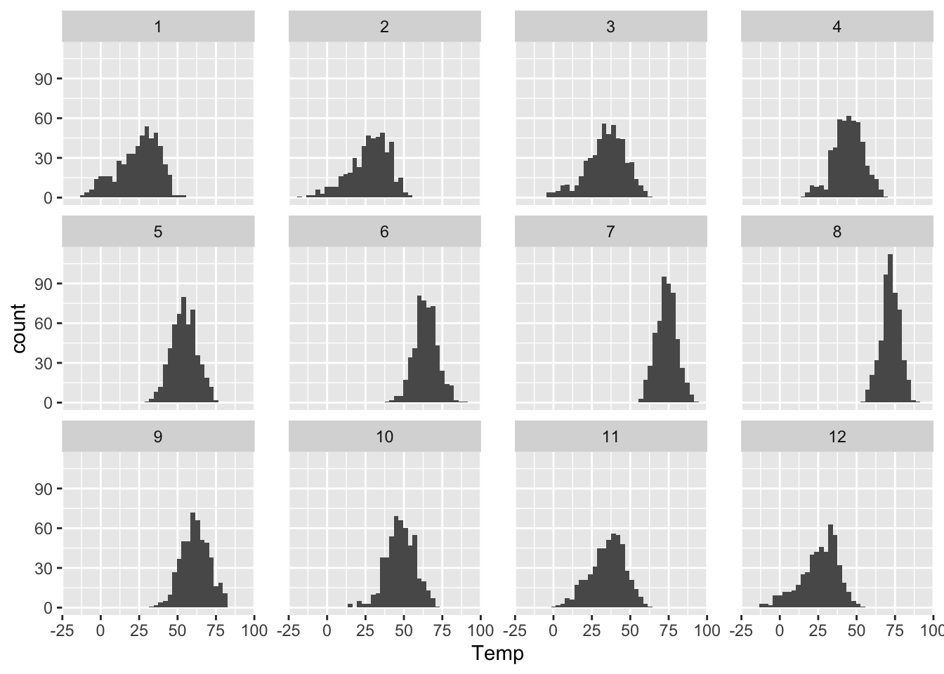 Let’s briefly discuss the concept of faceting, which is another effective strategy for showing more than two variables on a flat screen or page. Faceting means constructing multiple plots of the same fundamental type, with the same axes and scale, with each individual plot, called a facet, corresponding to some subset of the data. (You already saw an example of a faceted bar plot in Figure 4.2.)