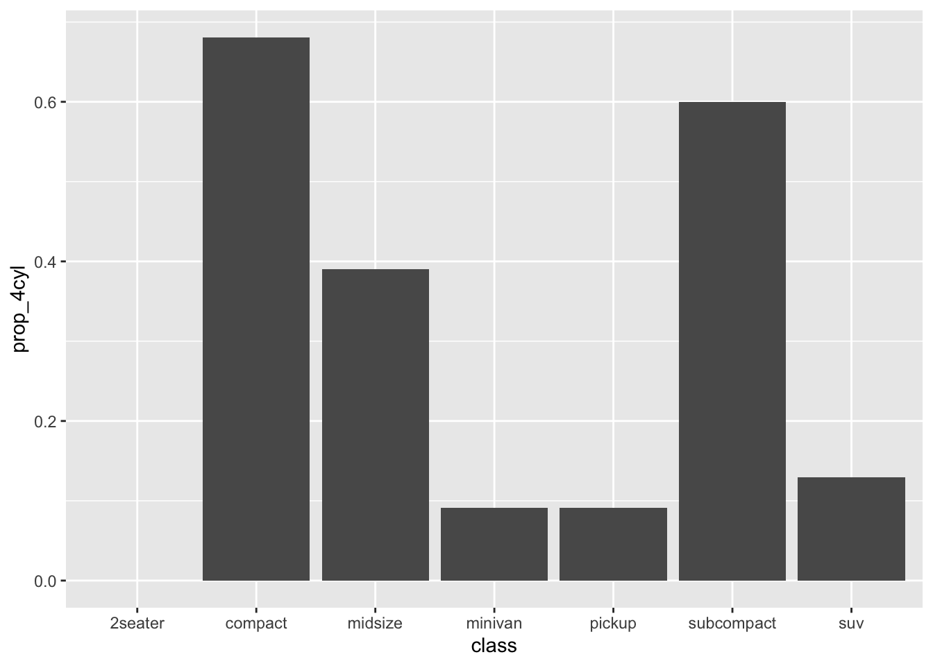 Let’s see a second example, where we plot the proportion of four-cylinder engines in each vehicle class. This entails changing the aesthetic mapping to use prop_4cyl for the \(y\) variable:
