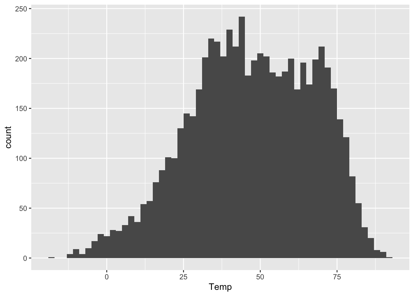 The Temp column, measured in degrees F, shows the average daily temperature, which is the midpoint between that day’s high and low temps. Let’s begin by re-examining the histogram of daily temperatures that we saw in a prior lesson.