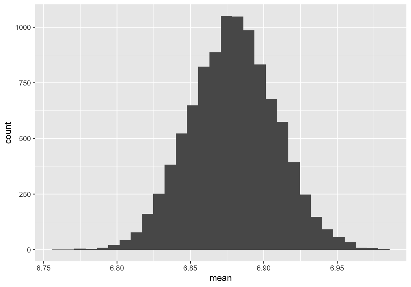 boot_sleep = do(10000)*mean(~SleepHrsNight, data=mosaic::resample(NHANES_sleep))This statement says to: 1) create 10,000 bootstrap samples from the original NHANES_sleep data frame, and 2) for each bootstrap sample, recompute the mean of the SleepHrsNight variable. We store the resulting set of 10,000 sample means in an object called boot_sleep.