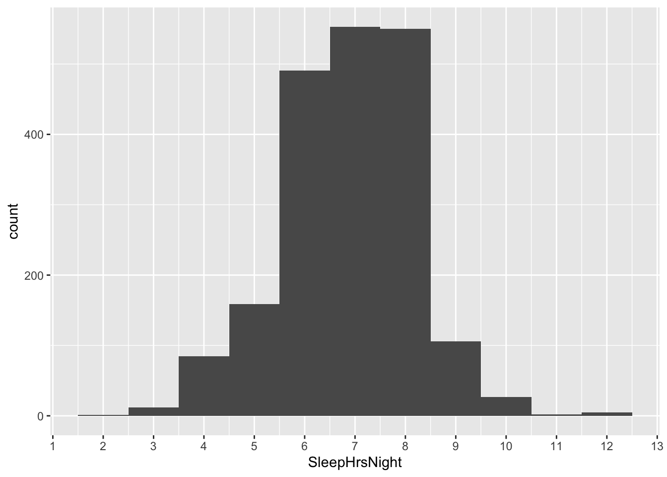 The first question we’ll address is: how well are Americans sleeping, on average? Our first pass here might be to plot the data distribution for the SleepHrsNight variable in a histogram: