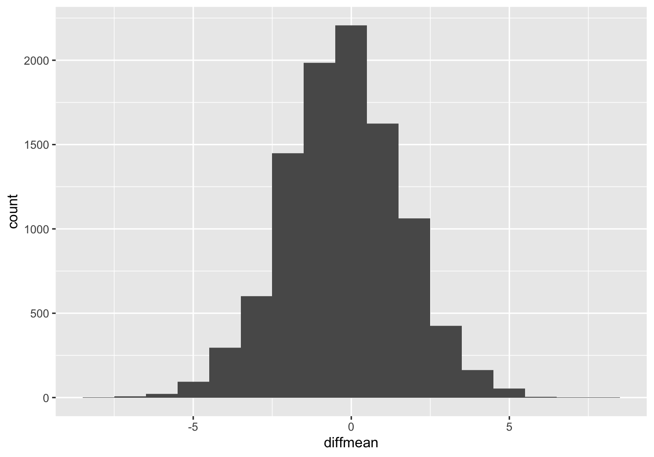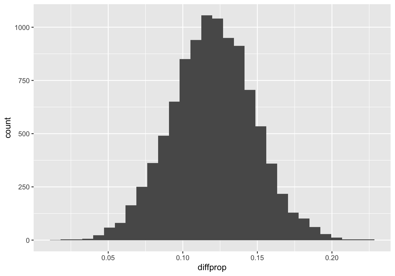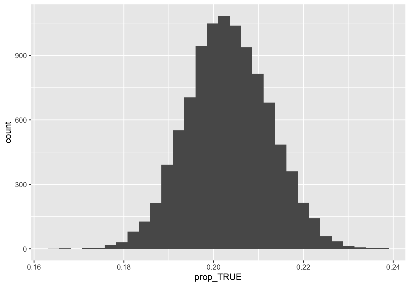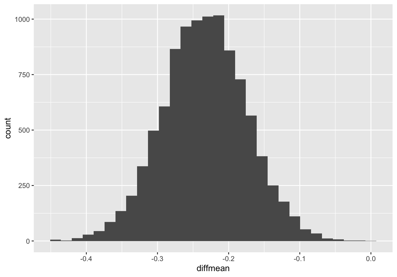 Let’s run 10,000 bootstrap samples to find out. It turns out that we can do this in a single line of R code that combines do with resample. (Remember do from our prior lesson on Sampling distributions.) The following line might take ten seconds or so to execute on your machine, so be patient: