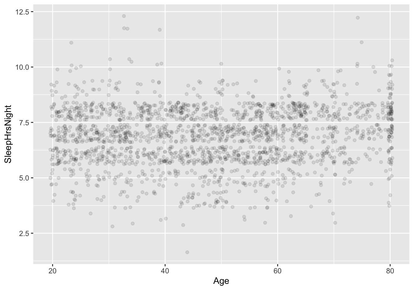 library(mosaic)Please also download and import the data in NHANES_sleep.csv. This file contains a sliver of data from the National Health and Nutrition Examination Survey, known as NHANES. NHANES is a major national survey run by the US Centers for Disease Control and Prevention (CDC). Per the CDC, it is “designed to assess the health and nutritional status of adults and children in the United States.” It is intended to be a nationally representative survey whose results can generalized to the broader American population—and indeed, it is basically as good as surveys ever get in that regard, at least outside the pages of a statistics textbook. Moreover, NHANES is unusually comprehensive as far as health surveys go, in that it combines both interviews and physical exams.