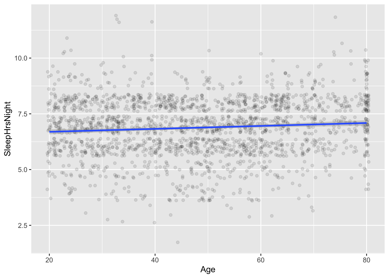 mosaic::, but it’s better to be sure that R knows which version ofresamplewe want. In particular, if you loadtidyversefirst andmosaicsecond, R should assume automatically that you want the version of resample frommosaicand not from any of thetidyversepackages.↩︎This is a tad misleading. A more detailed look at the NHANES data shows a small average dip in average sleep time from from ages 20-50, and then a small rise from ages 50-80. But the rise at the back end is a bit steeper than the dip at the front end, for a small net-positive average effect from ages 20-80.↩︎