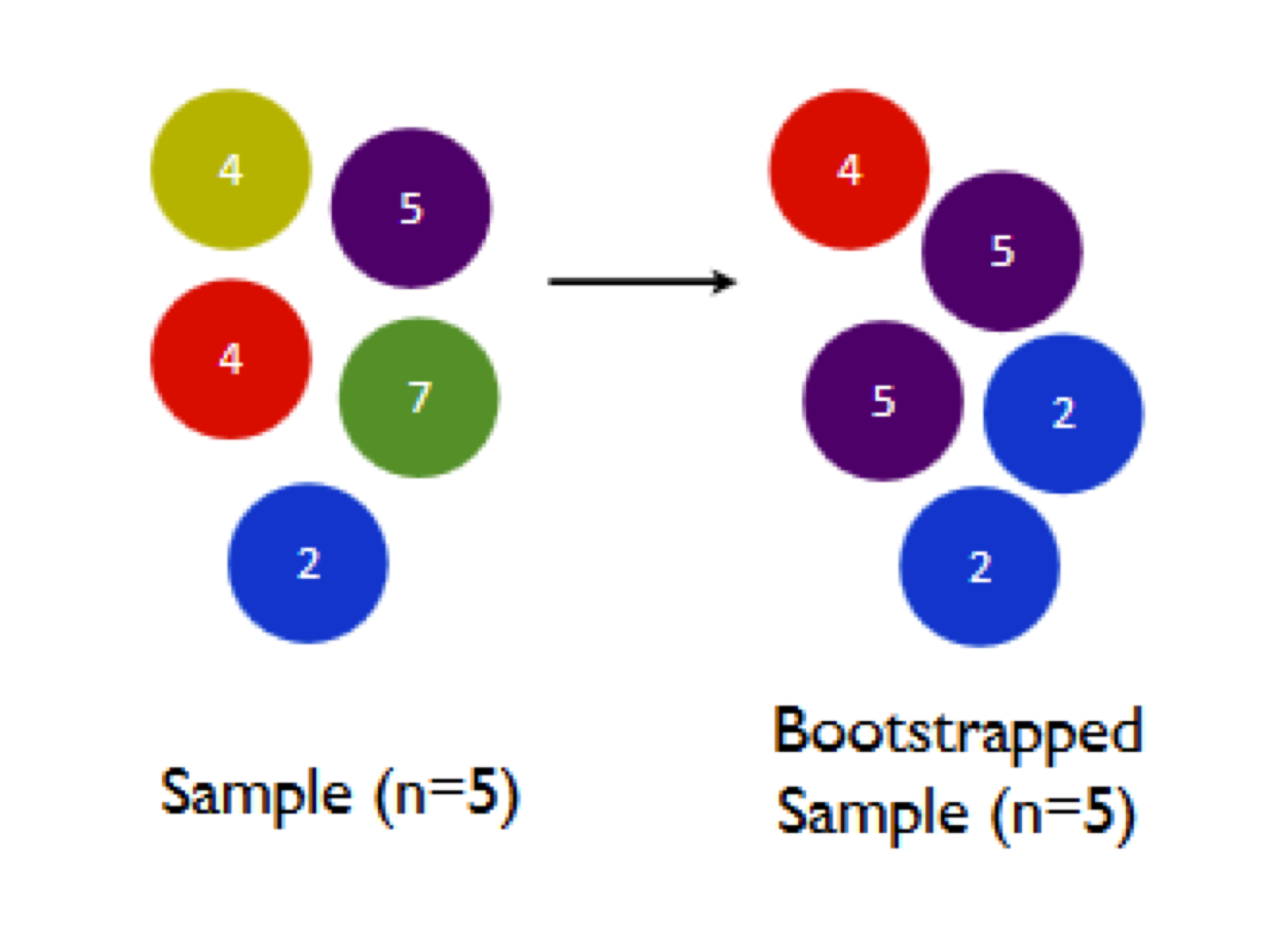 Notice the two key properties of our bootstrap sample: (1) the bootstrap sample is the same size (N=5) as the original sample; and (2) the bootstrap sample was taken with replacement, and therefore has a random pattern of duplicates and omissions when compared with the original sample. Specifically, the red 4 has been omitted entirely, while the green 7 has been chosen twice.