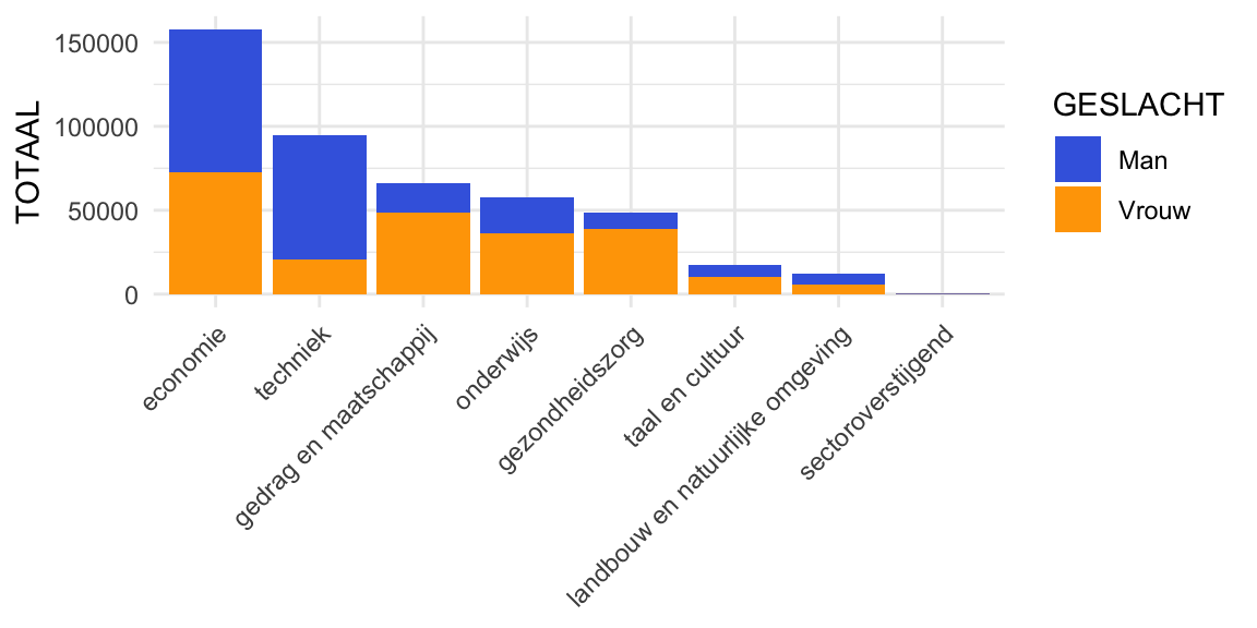 Figuur 2: Barplot stacked, aantal ingeschreven studenten per studierichting in academisch jaar 2018-2019 bij hbo-instellingen in Nederland uitgesplitst naar geslacht. Voorbeeld van bivariate analyse van verband tussen twee categoriale variabelen