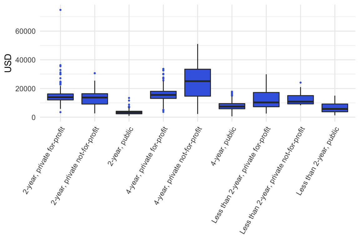 Note. Categories: 1 = 4-year, public; 2 = 4-year, private not-for-profit; 3 = 4-year, private for-profit; 4 = 2-year, public; 5 = 2-year, private not-for-profit; 6 = 2-year, private for-profit; 7 = Less than 2-year, public; 8 = Less than 2-year, private not-for-profit; 9 = Less than 2-year, private for-profit. The spread in the 4-year, private not-for-profit program fees is by far the highest. Data retrieved from this website.