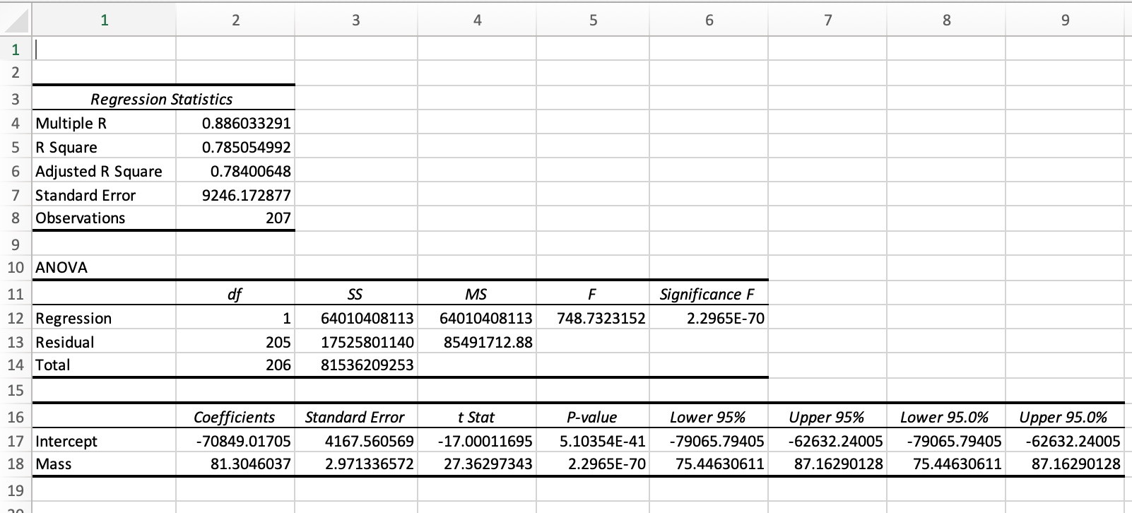 Another way to assess the coefficient is based on the reported P-value of the MASS variable. This P-value of the coefficients is used to determine whether an X-variable is significant in the model. Most common interpretation: a P-value less than .05 indicates that the X-variable is significant. The test for which this P-value is calculated is: