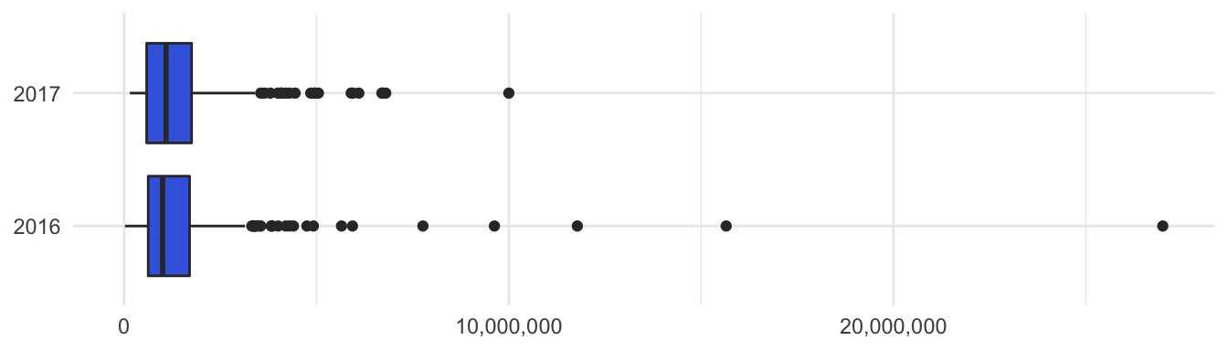Figure 1. Boxplots selling prices houses (GBP) in City of Westminster district in London. A comparison is made between the selling prices in January 2016 and in January 2017.