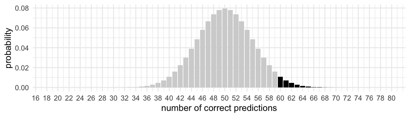Figure 2. Binomial distribution with n = 100, p = .50. The black area corresponds with the probability of 60 or more successes in 100 trials under the assumption that a probability of a success equals 0.50.