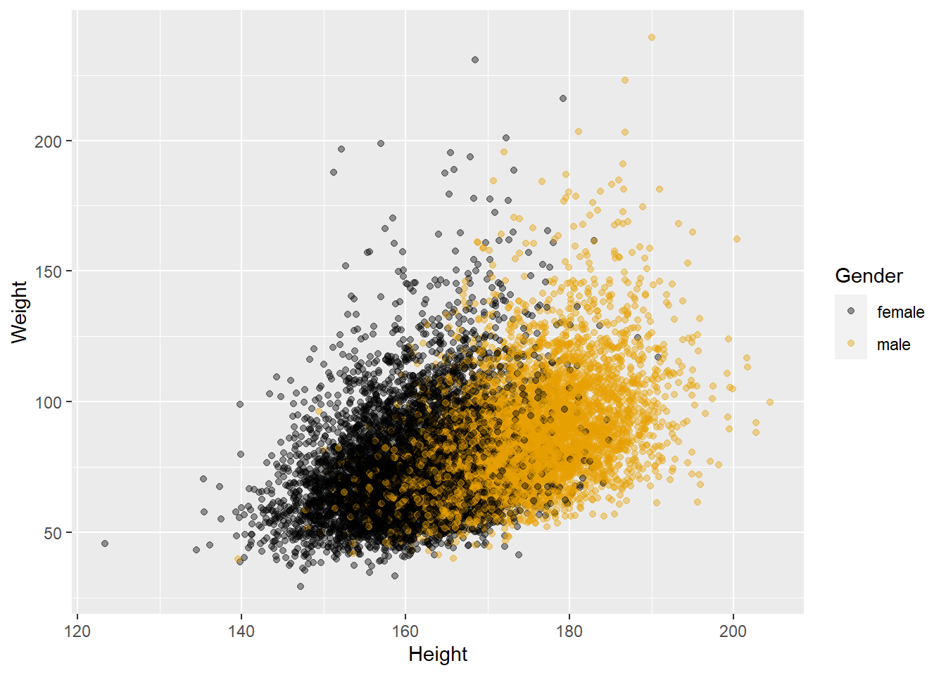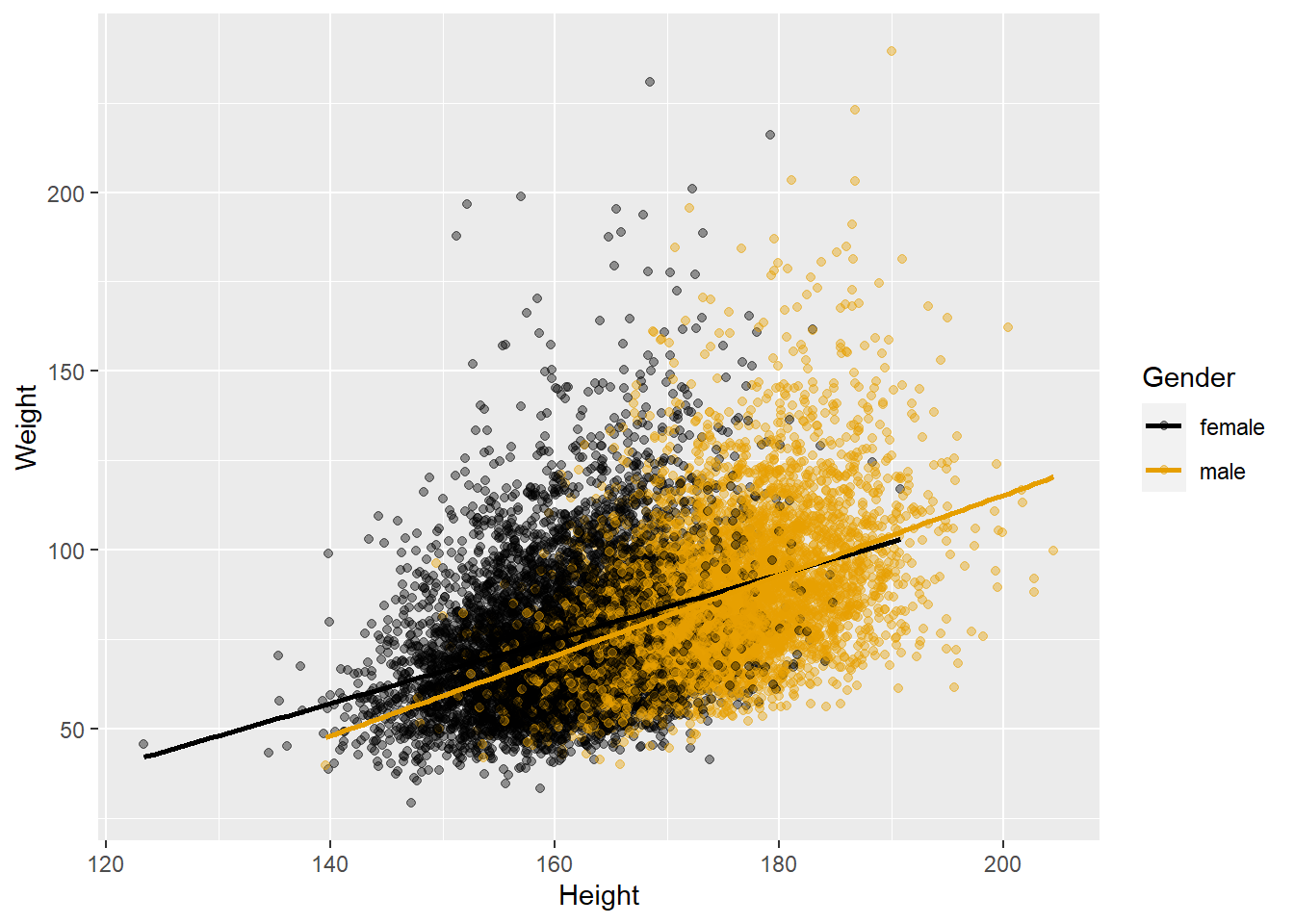 ggplot(data = adults, aes(x = Height, y = Weight, colour = Gender)) +