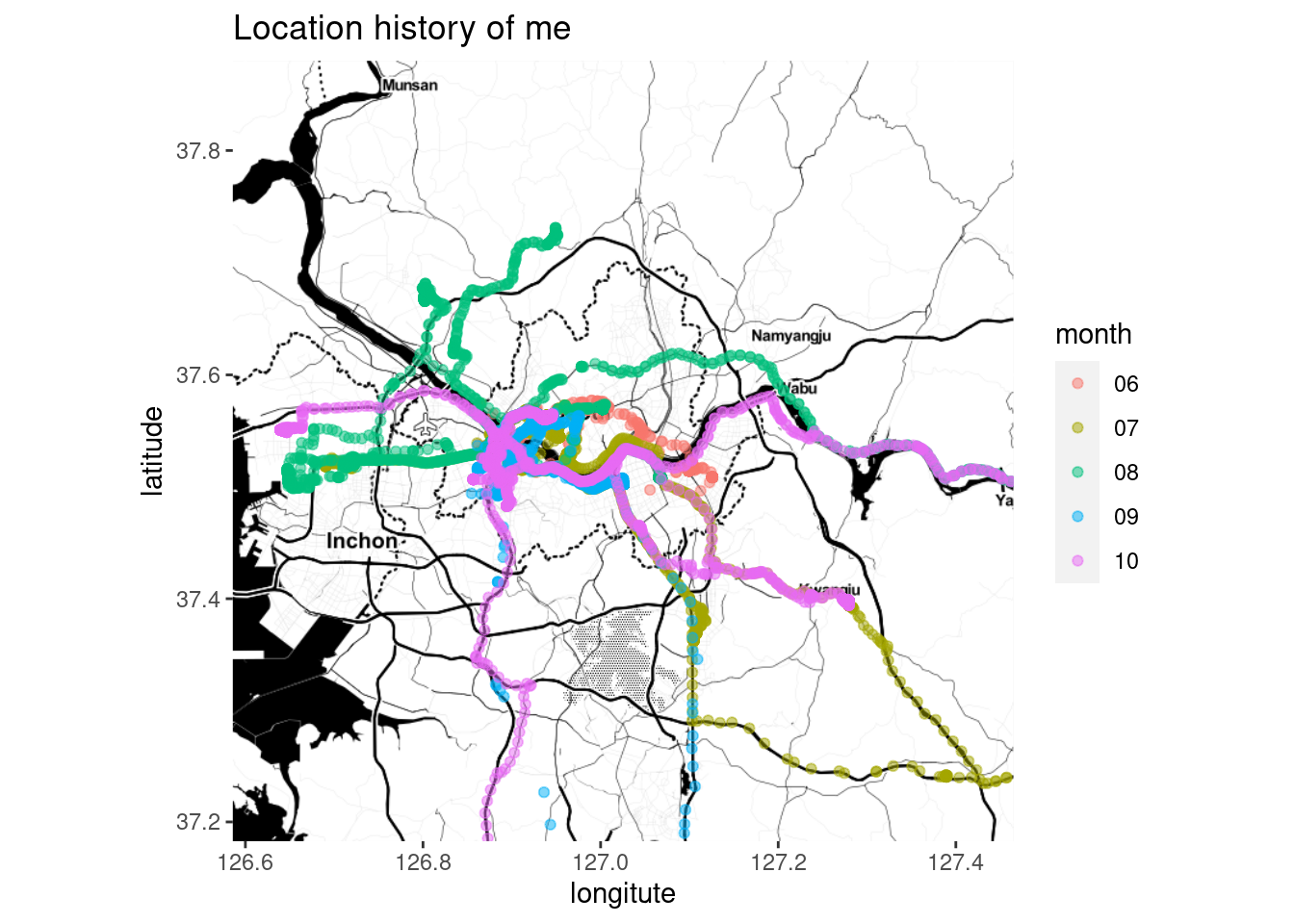 이제 지도를 다운 받았으니, 여기에 제 위치를 살펴 보도록 하겠습니다. 월 별로 색을 다르게 하여 표시해 보겠습니다. 7월에는 원주 건강보험공단 빅데이터 분석한다고 다녔던게 남아 있네요. 나머지 달에는 여러 공장에 돌아다닌 것이 나타나네요.
