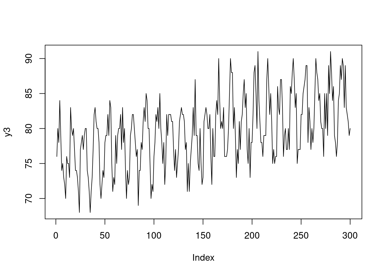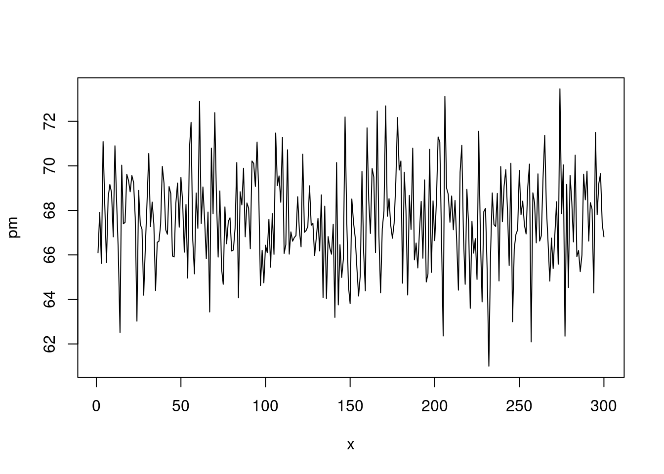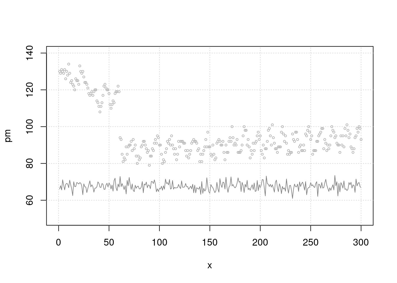 plot(x, pm, type="l", col=grey(0.5), ylim=c(50, 140), xlim=c(0, 300))