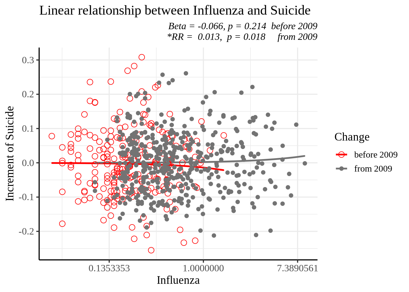 subtitle="Beta = -0.066, p = 0.214 before 2009\n *RR = 0.013, p = 0.018 from 2009") +