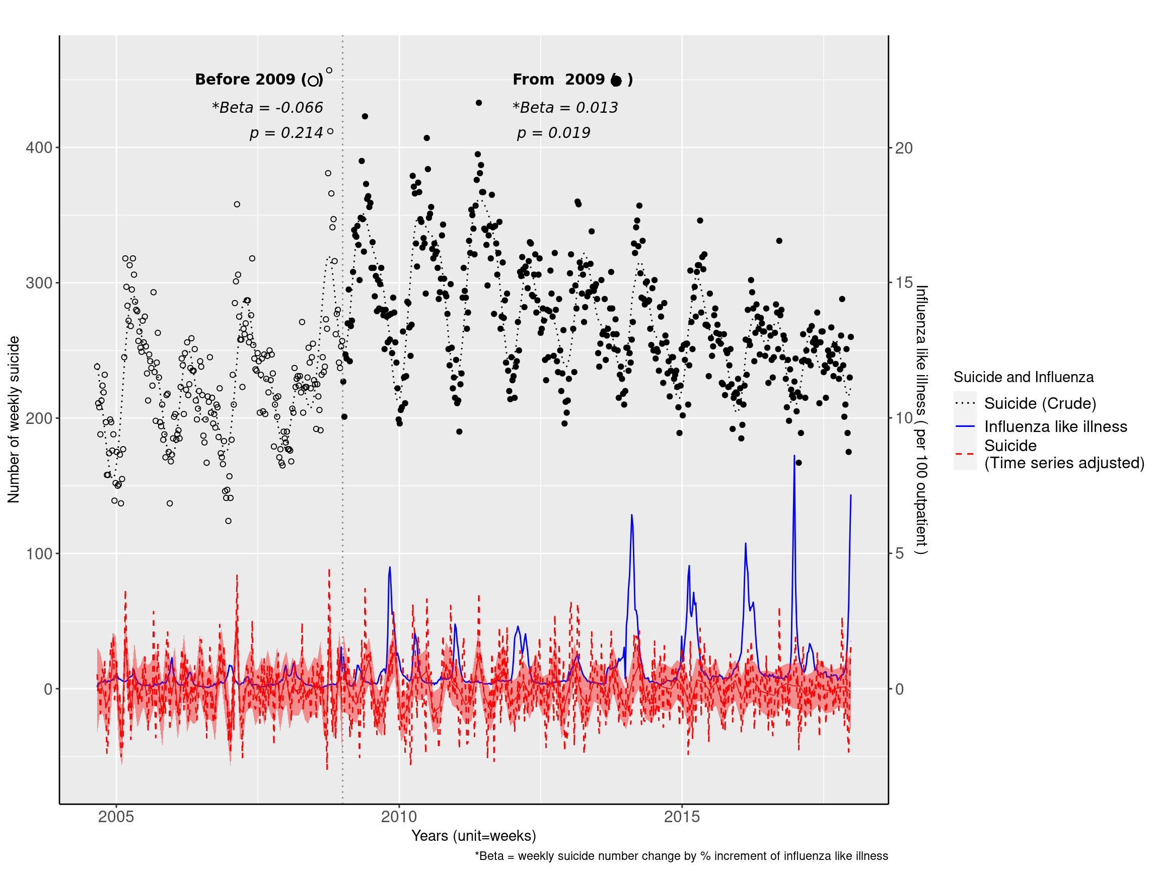 labels=c("Suicide (Crude)", "Influenza like illness", "Suicide \n(Time series adjusted)"),