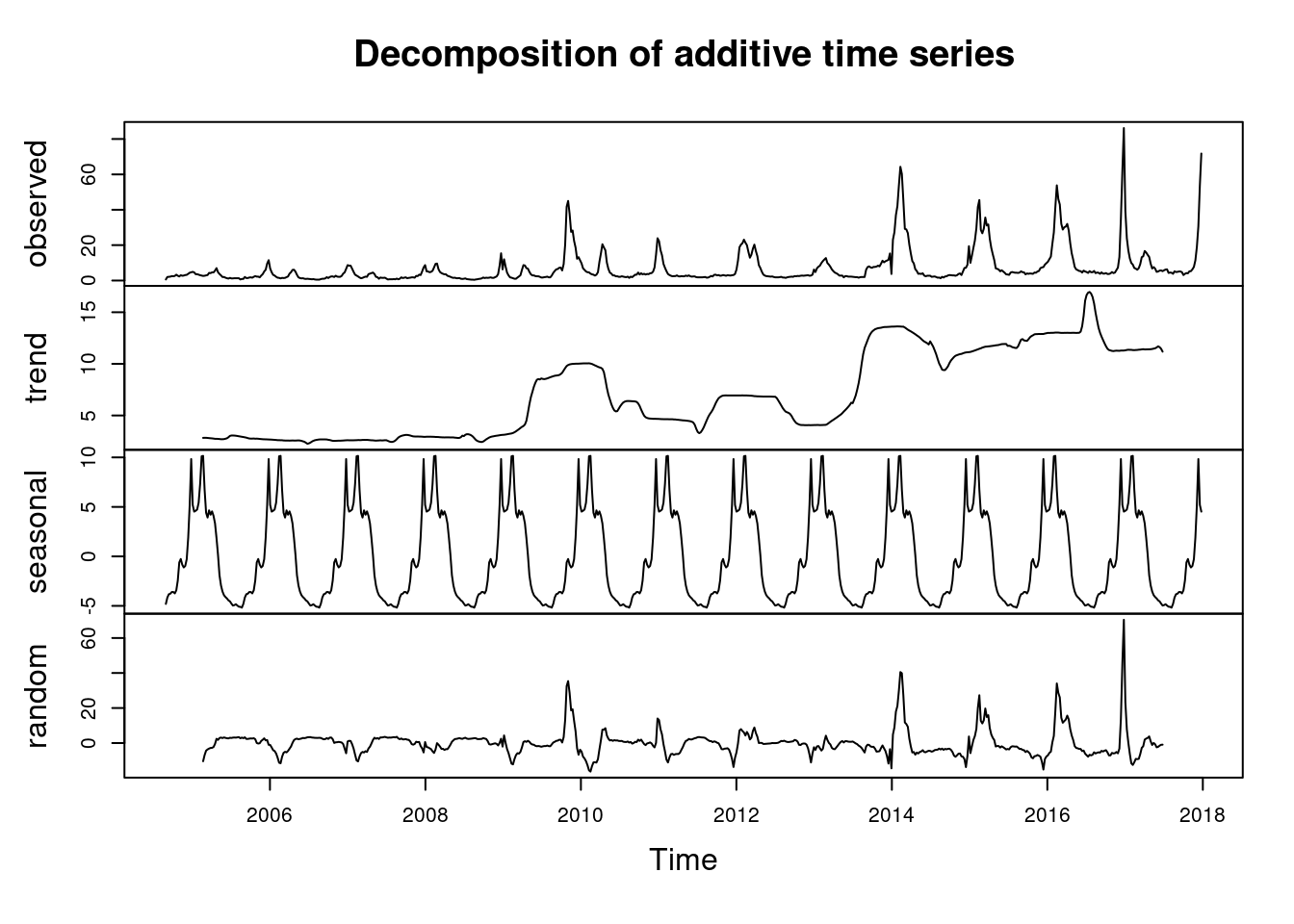 Going to step further, we can add or decompose weekly moving average (\(u_{t}\)) \[u_{t} = \bar{u}_{t}^{W}+(u_{t} - \bar{u}_{t}^{W}) \tag{1.4}\]
